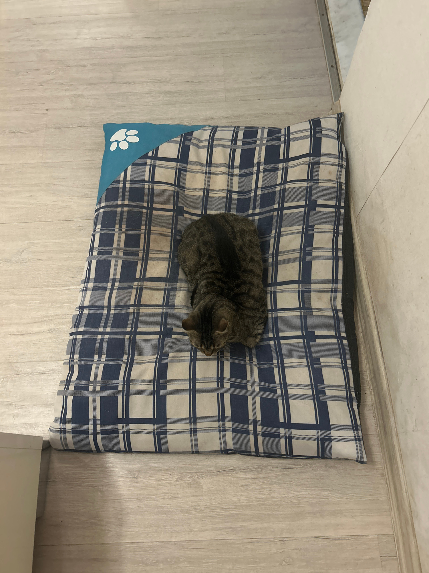 A gray tabby cat is curled up on a blue and white plaid pet bed with a blue corner featuring a white paw print. The bed rests on a light-colored, wood-look floor. The image is shot from an overhead pe…read more