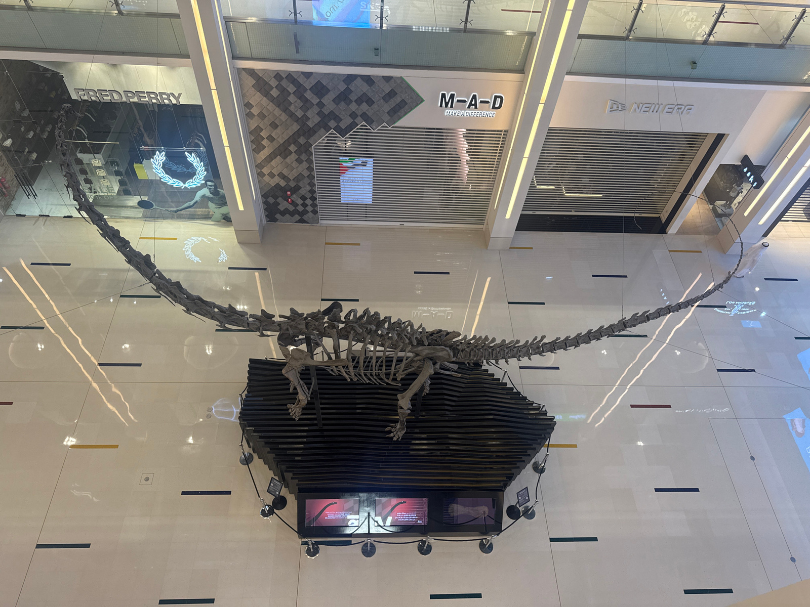 This is an overhead shot taken inside the Dubai Mall in Dubai, United Arab Emirates. The image prominently features a long-necked dinosaur skeleton on a raised black platform. The skeleton's head is p…read more