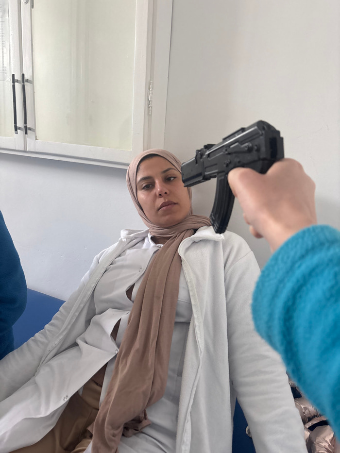 A woman wearing a hijab and a white coat is pictured from a low angle. A black toy gun is pointed at her head. An arm, clad in a blue sweater, holds the gun. The woman looks directly at the camera wit…read more