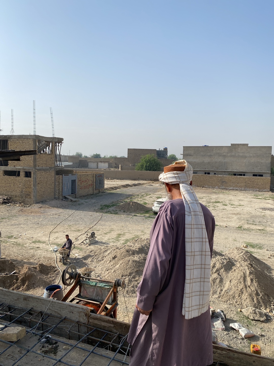 This image depicts an active construction site under a clear, bright blue sky in Kandahar, Afghanistan. The main subject is a man seen from behind, standing on what appears to be an unfinished rooftop…read more