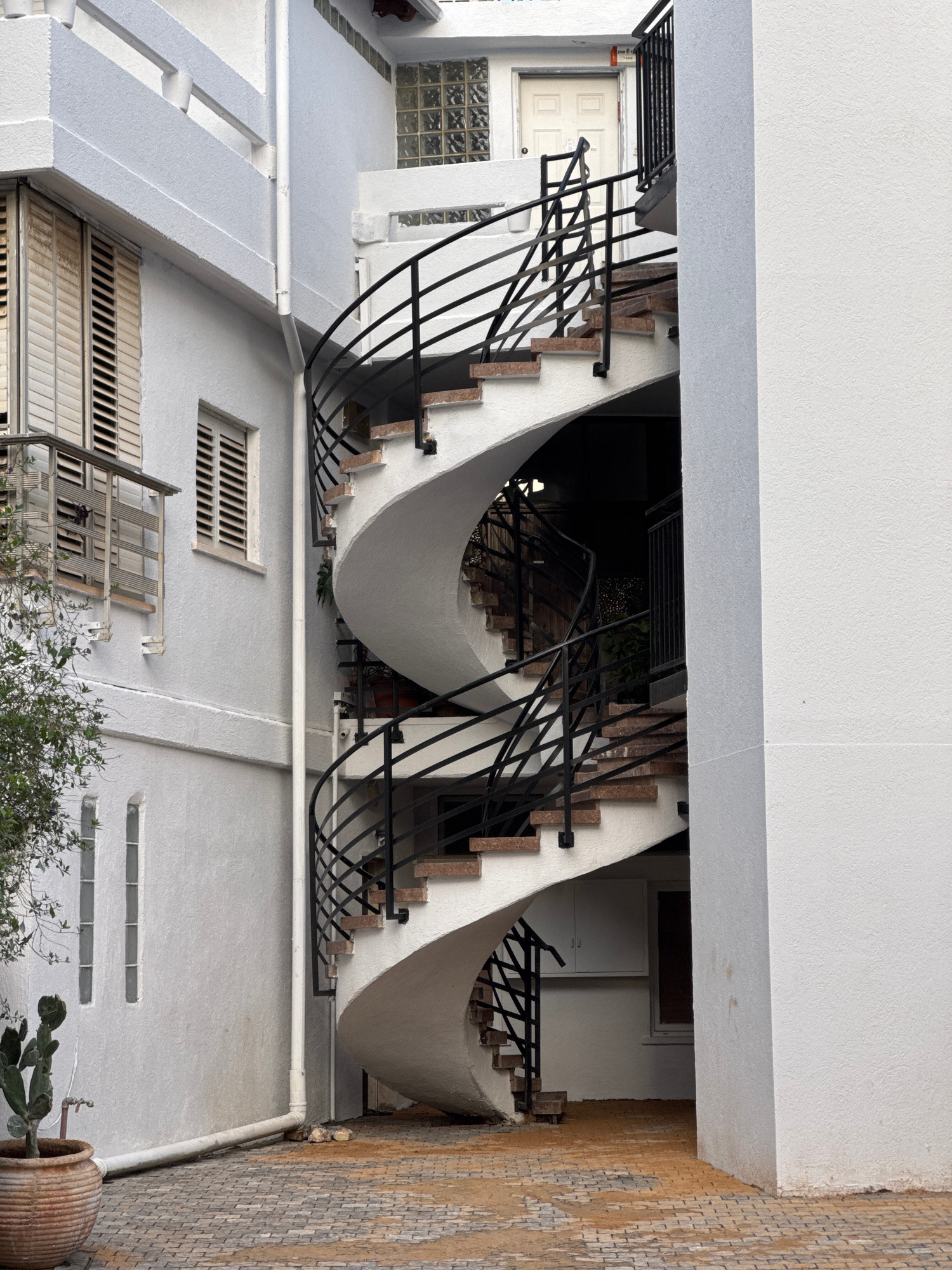 This image displays an exterior architectural scene in Ramat Gan, Israel, dominated by a multi-story external spiral staircase positioned between two white stucco building sections. The staircase feat…read more