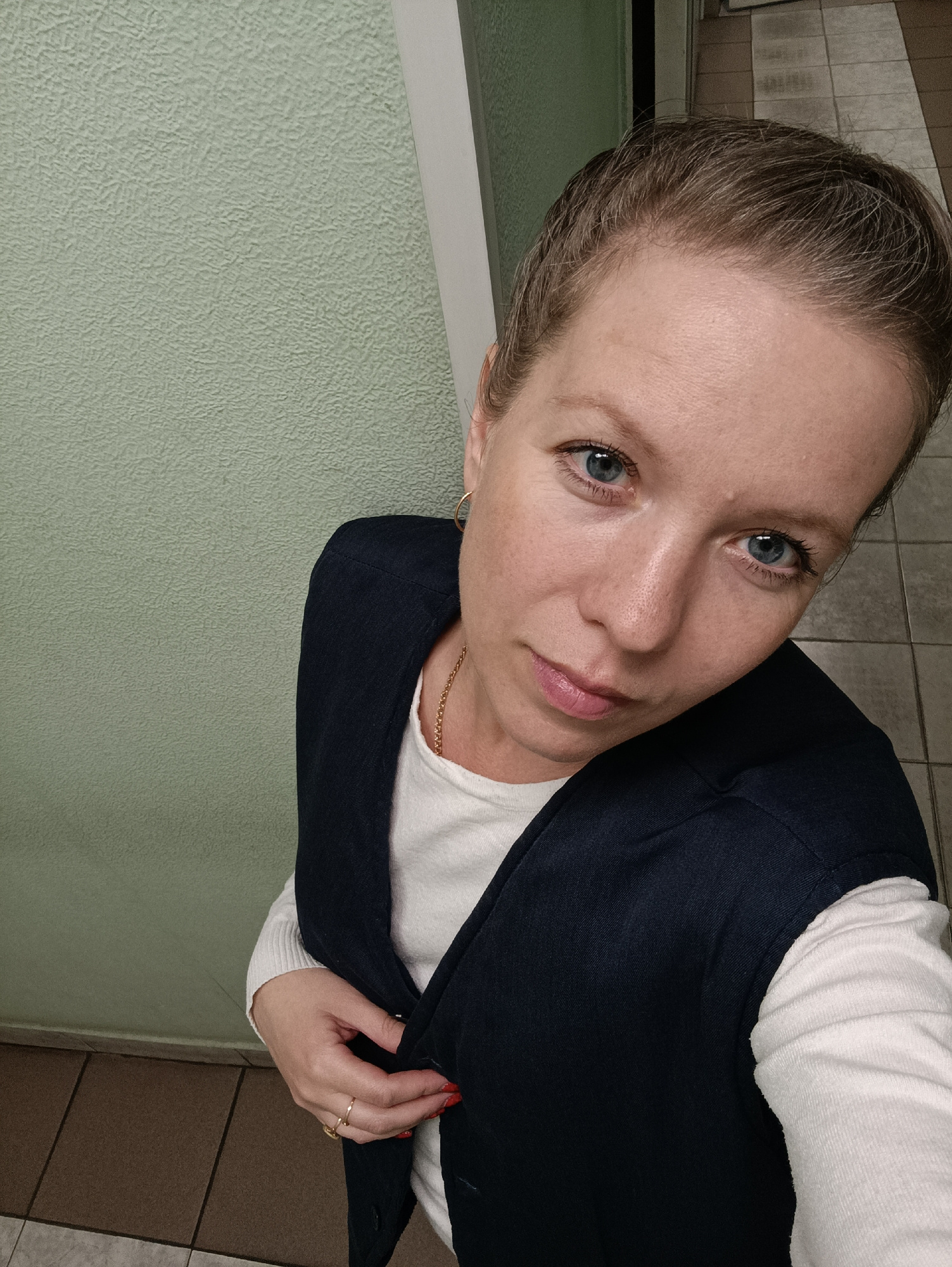 A woman with fair skin, short blonde hair, and blue eyes is taking a selfie in a room. She is wearing a white long-sleeved shirt under a navy blue vest. She has gold hoop earrings and a gold chain nec…read more
