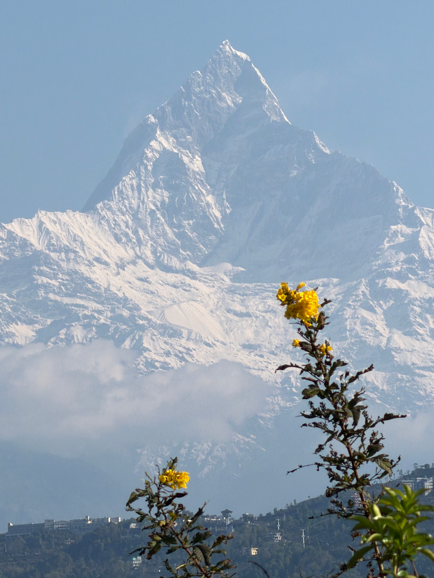 The image features a large, snow-covered mountain peak set against a clear, pale blue sky. To the right, a tree branch with yellow flowers frames the view. The lower right portion of the image reveals…read more