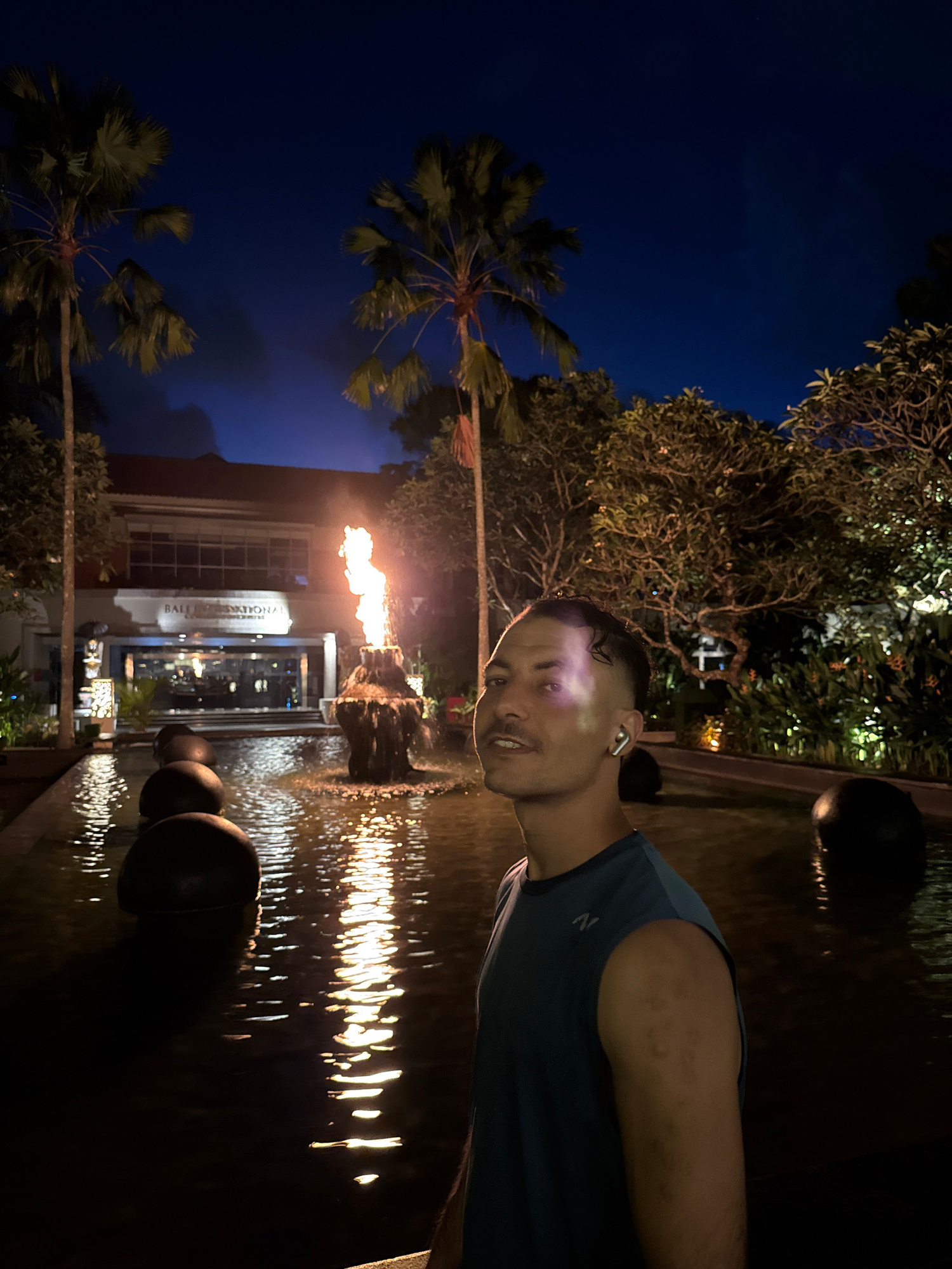 The photograph captures a man wearing a blue tank top standing alongside a decorative water feature at night. He has an earpiece in his left ear. The water feature consists of a dark, reflective pool,…read more