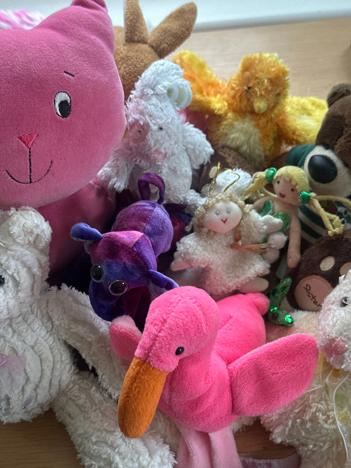 A static, close-up, high-angle view depicts a dense collection of assorted plush toys and small dolls resting on a light-colored surface, likely a wooden floor or table, against a lighter background.…read more