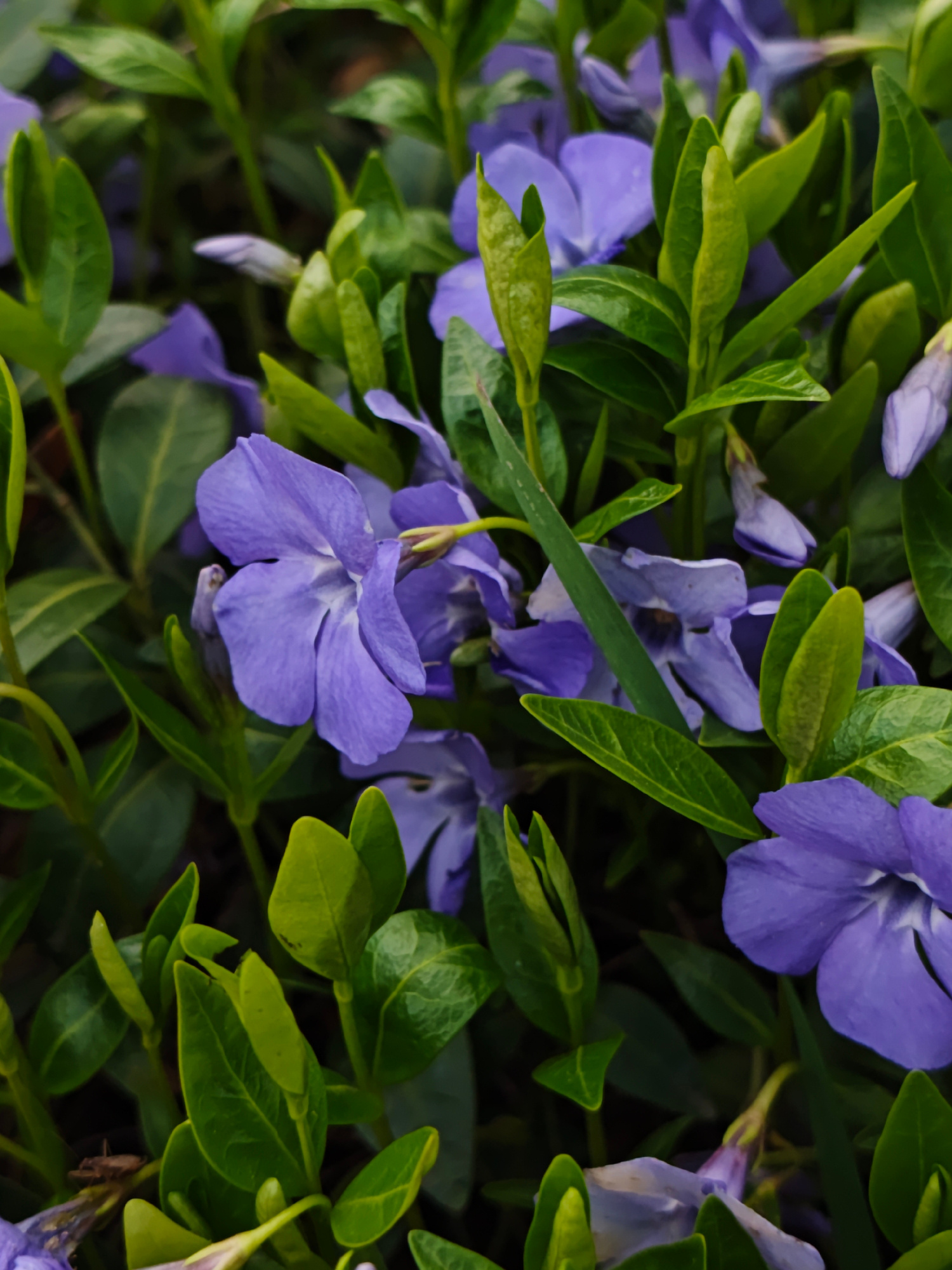 The image displays a dense ground cover of Vinca minor, or common periwinkle, with vibrant purple flowers interspersed amongst lush green foliage. The leaves are oval and glossy. The flowers exhibit a…read more