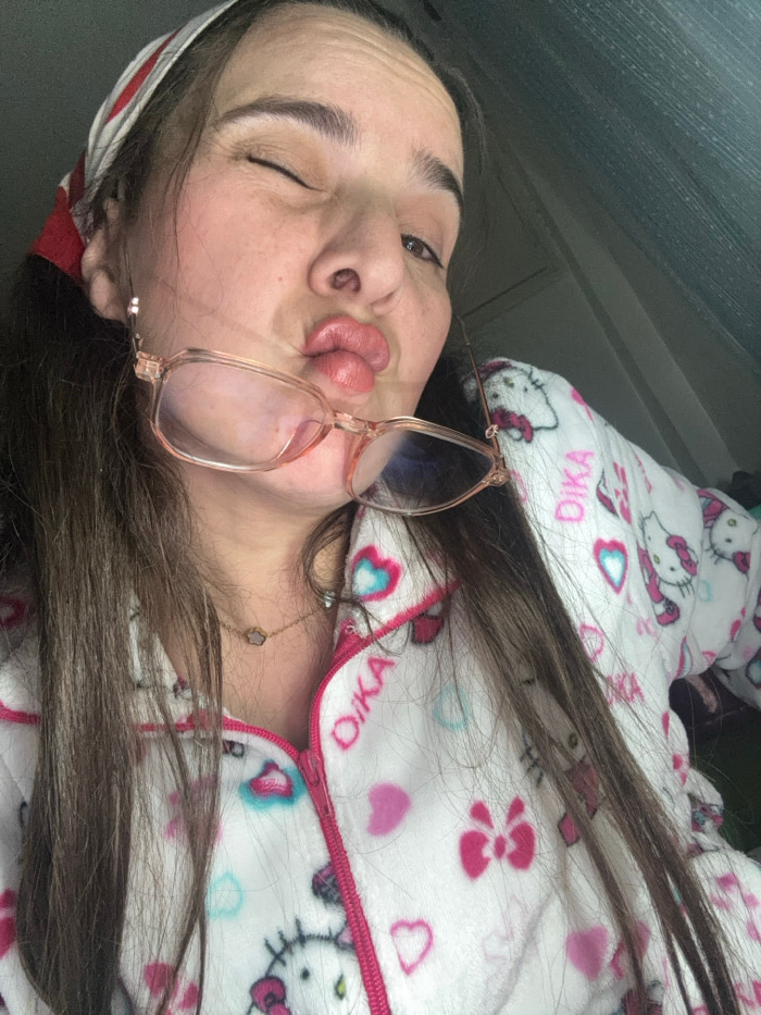 A young woman in Hello Kitty pajamas winks, her lips puckered. She's wearing rose-colored glasses perched on her nose. A matching headband is visible. Her hair is long and brown. A clover necklace is…read more