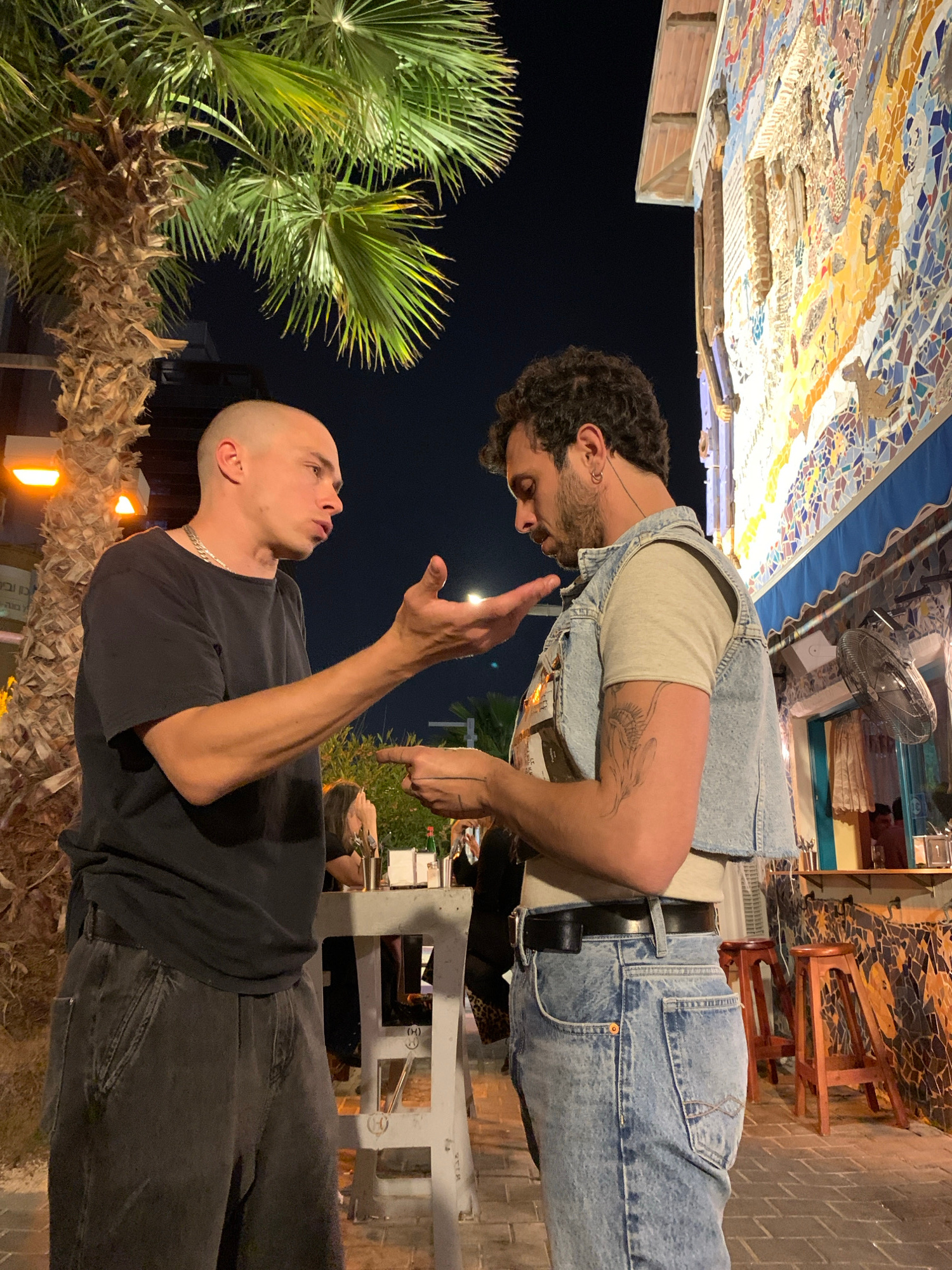 Two men are standing outside at night. One man is wearing a light-colored t-shirt and a denim jacket and jeans. The other man is wearing a dark t-shirt and jeans. They appear to be looking at somethin…read more
