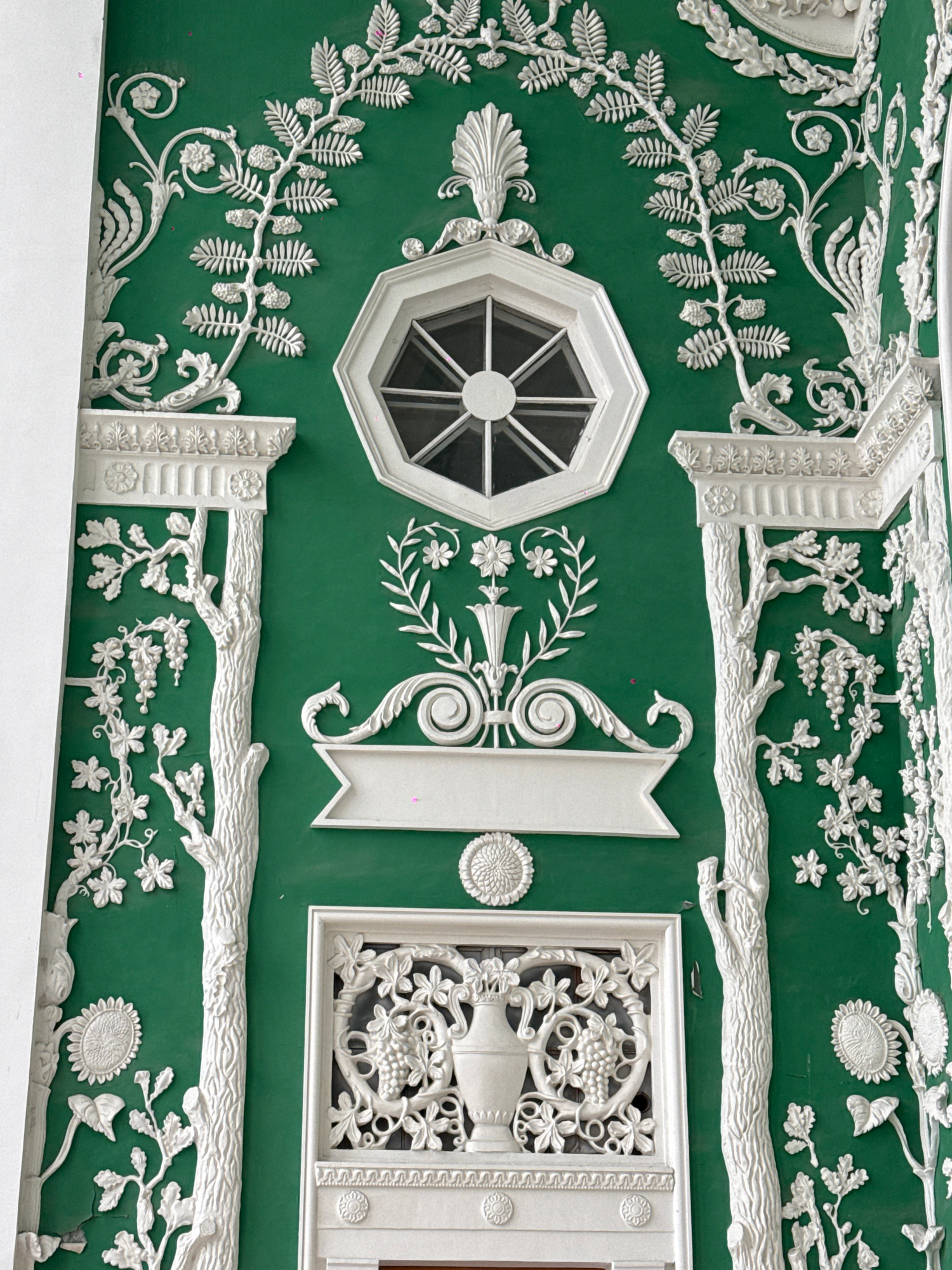 This image shows a detailed section of the ceiling in the Green Dining Room of the Ostankino Palace in Moscow, Russia. The ceiling is predominantly green with ornate white stucco details. These includ…read more