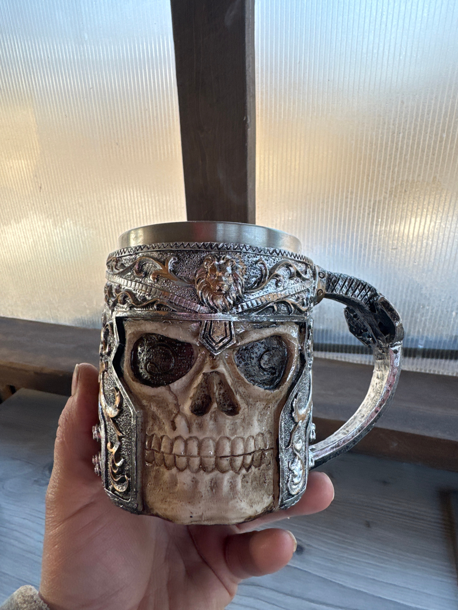 A decorative skull mug is held in a hand. The mug features a skull motif with ornate silver-colored metal detailing, including a handle shaped like a snake. The skull itself is a light beige color wit…read more