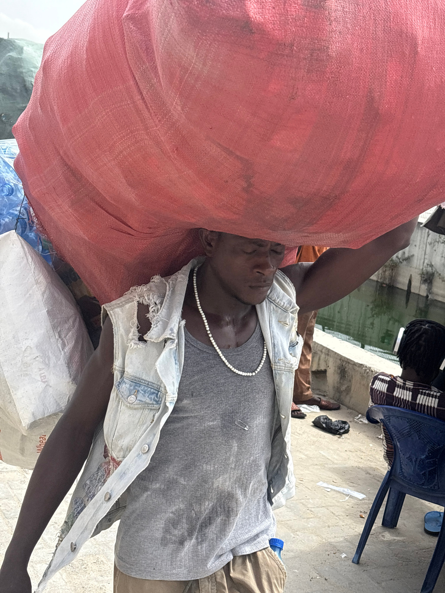 A person wearing a gray t-shirt, a denim jacket, and a pearl necklace lies under a large red sack. The scene is in Igboefon, Nigeria. Other details include: a blue chair, a person wearing a black andβ¦read more