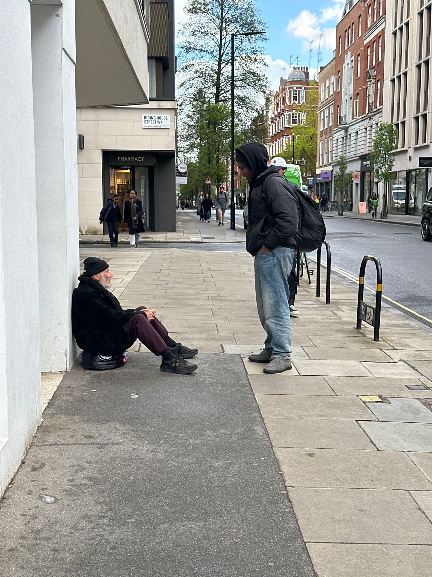 Two individuals are engaged in a physical balancing act on a city street. One person, wearing a black jacket, blue jeans, and gray shoes, is in a horizontal plank position, supporting their weight on…read more
