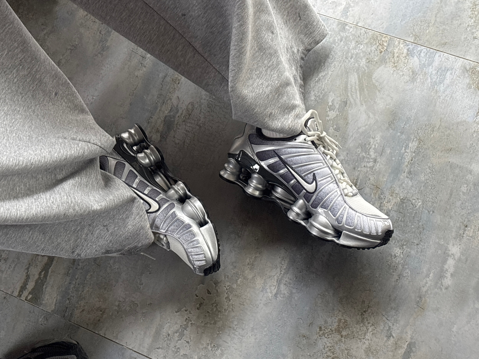 The image shows a person wearing grey sweatpants and silver Nike Shox TL sneakers on a grey tiled floor. The floor appears to be indoors. No information suggests the location is Zovuni, Armenia.