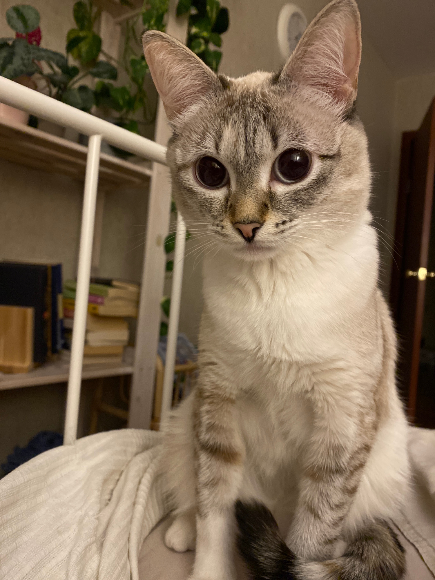 A close-up, low-angle shot shows a cat, primarily white with grey tabby markings on its head and back, with large, dark eyes, facing the camera. The cat is positioned on or behind a white metal shelf…read more