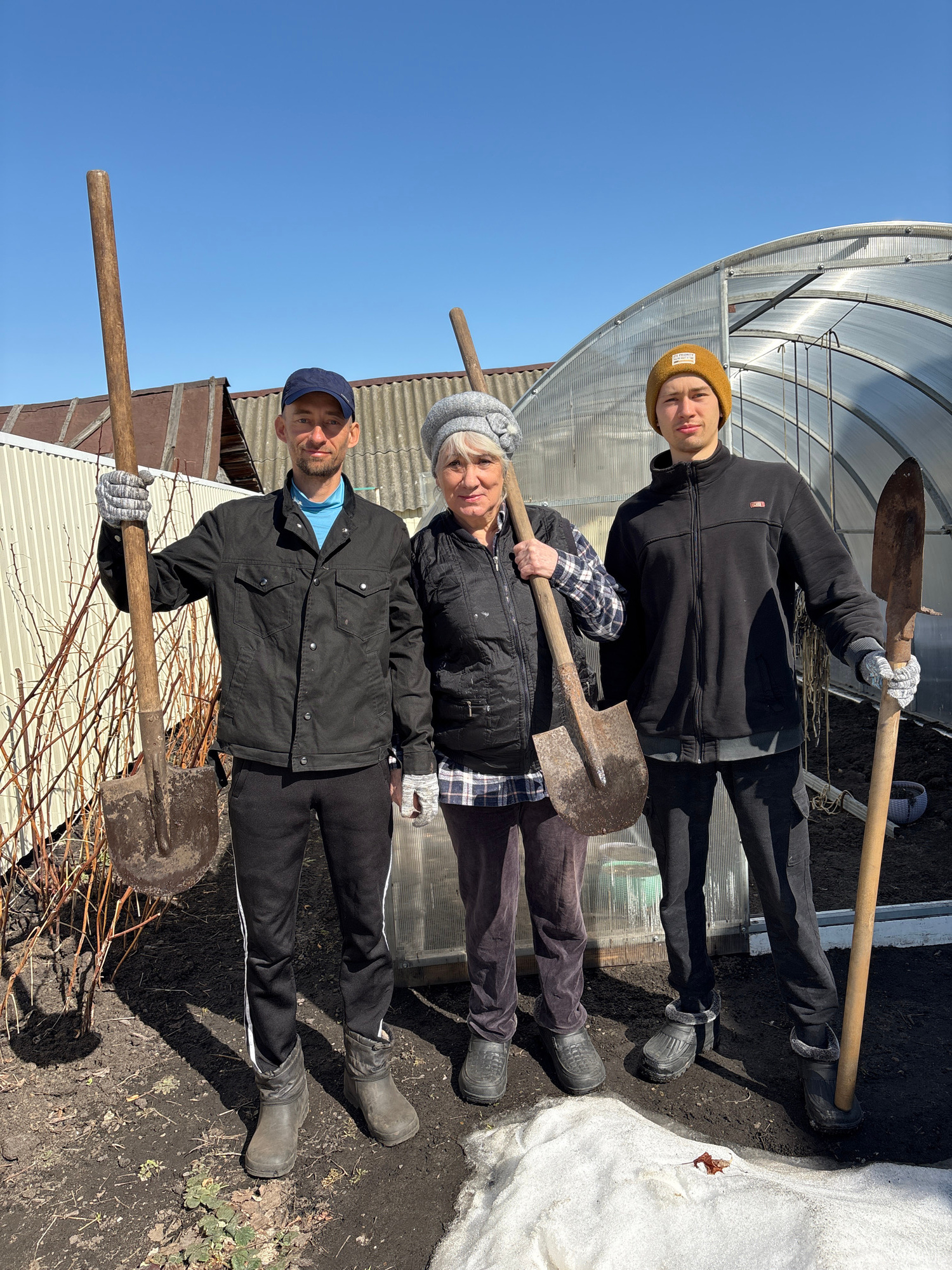 Three people are standing in a garden near a greenhouse, holding shovels. The person in the foreground is a man wearing a blue baseball cap, a blue t-shirt, and a black jacket with matching black pant…read more