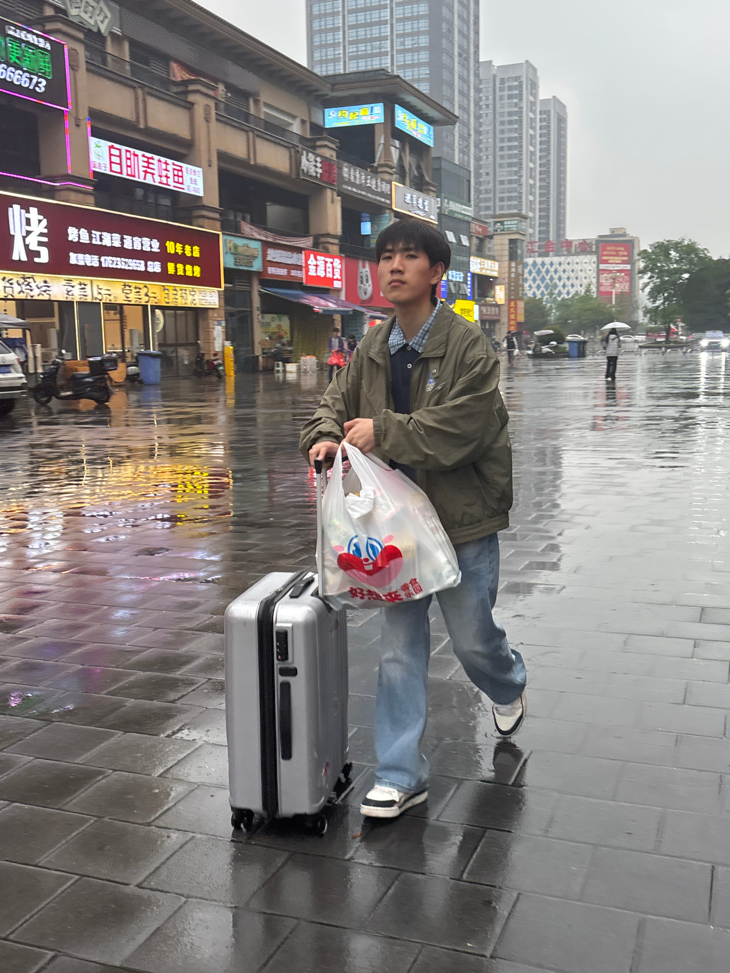 A young Asian male stands on a wet, grey brick sidewalk in Jiangjin, China, pulling a silver suitcase. He is wearing a green jacket, blue jeans, and dark shoes with white accents, and carrying a trans…read more