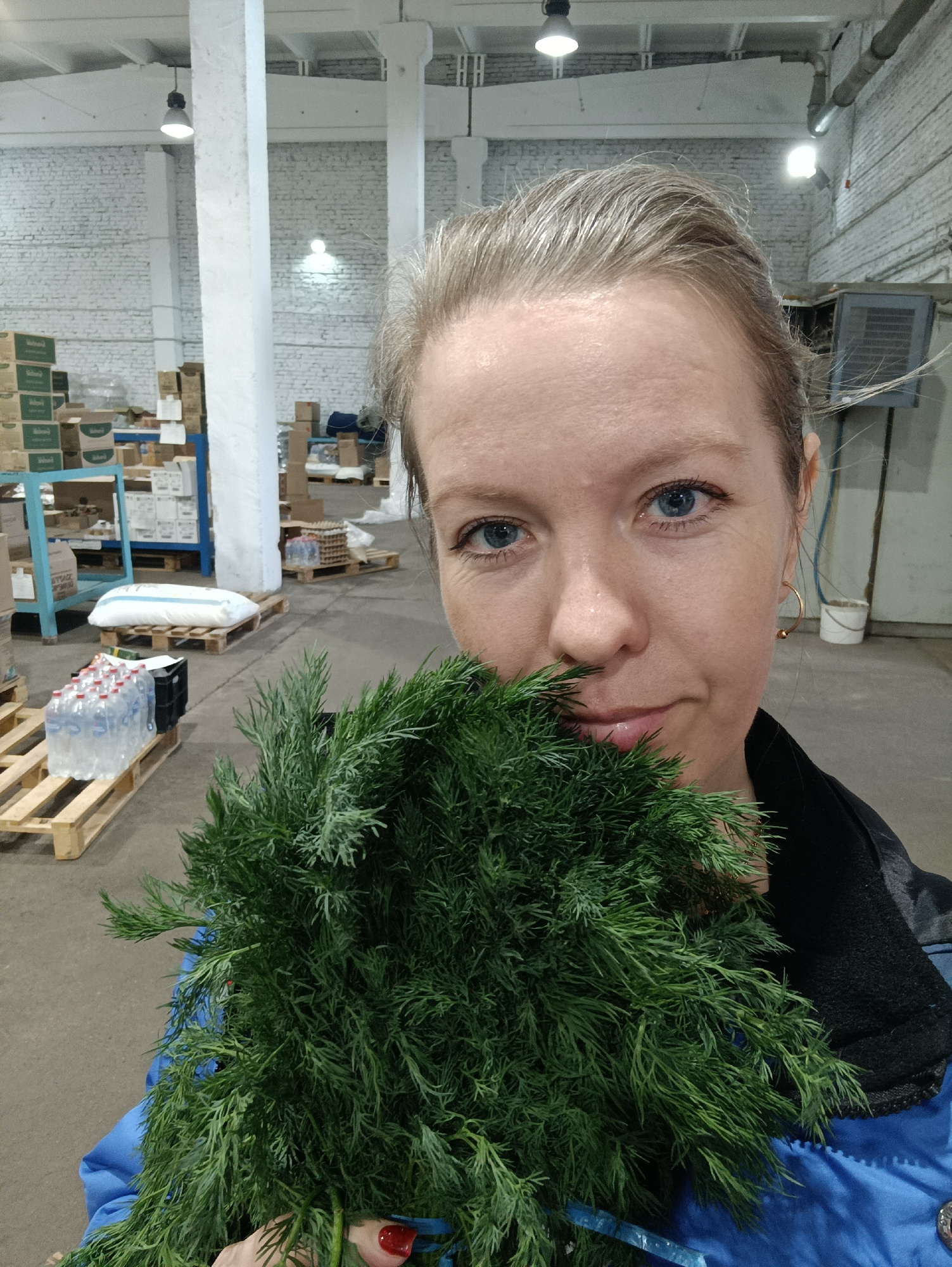 A medium shot depicts a woman holding a substantial bunch of fresh green dill in front of her face, covering her mouth and chin. She has fair skin, striking blue eyes, and light-colored hair pulled ba…read more
