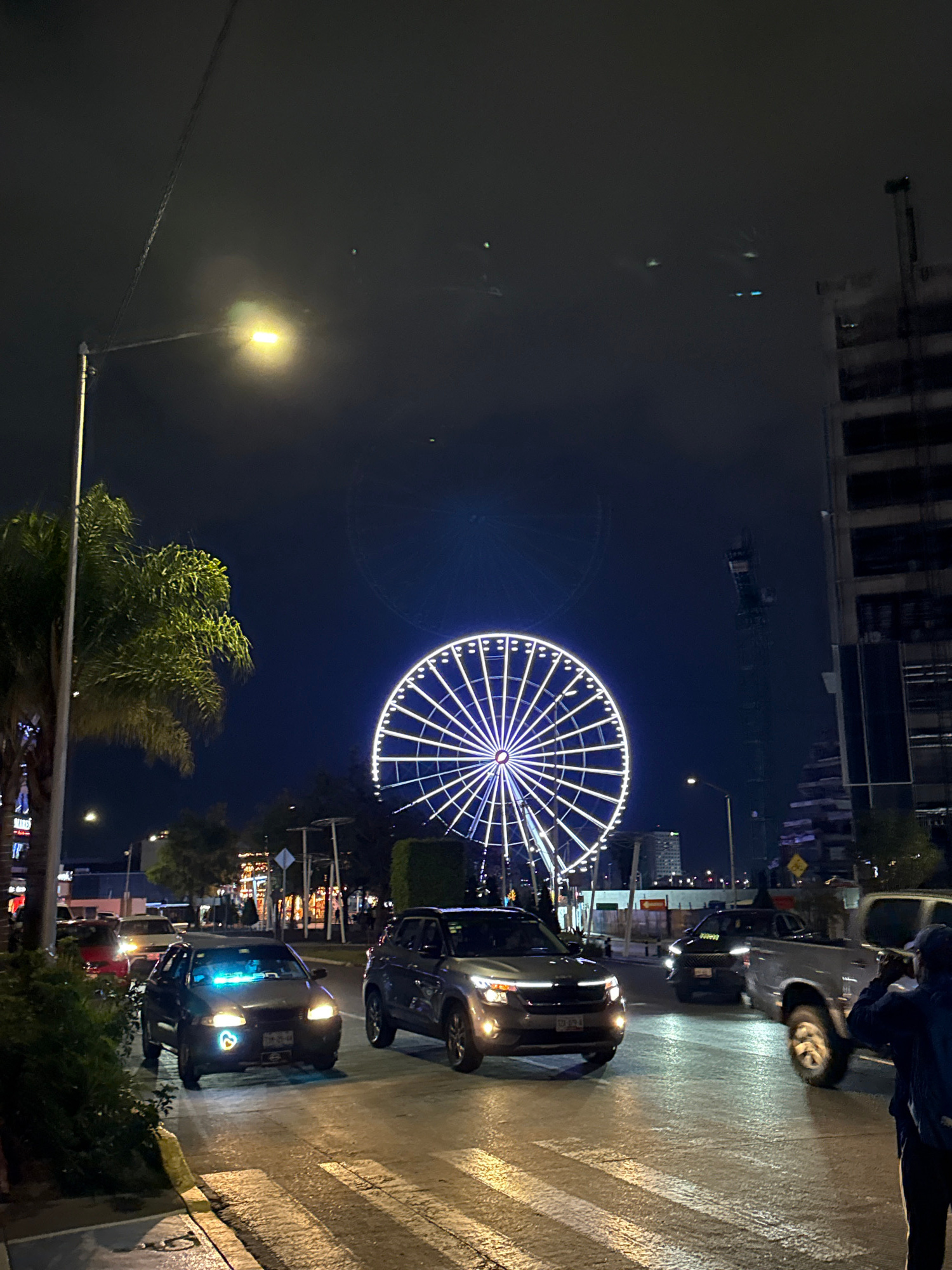The image shows a street scene at night in Puebla, Mexico. A large Ferris wheel is illuminated in the background. Cars are parked and driving along the street. A person is visible standing near the ca…read more