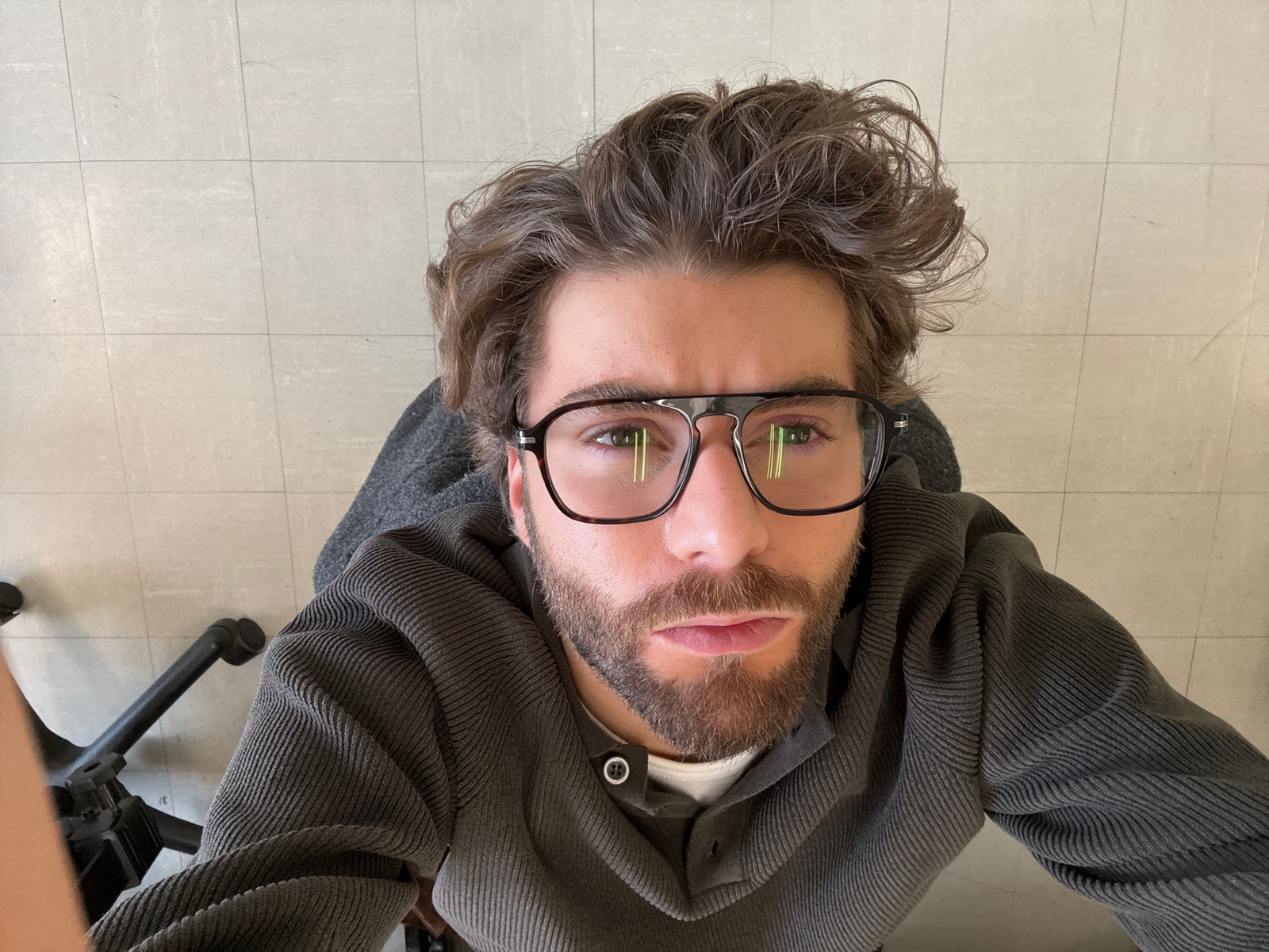 A high-angle shot captures a man looking directly up at the camera, giving the impression of a selfie taken from above. The subject is a man with tousled, medium-brown hair and a neatly trimmed beard…read more