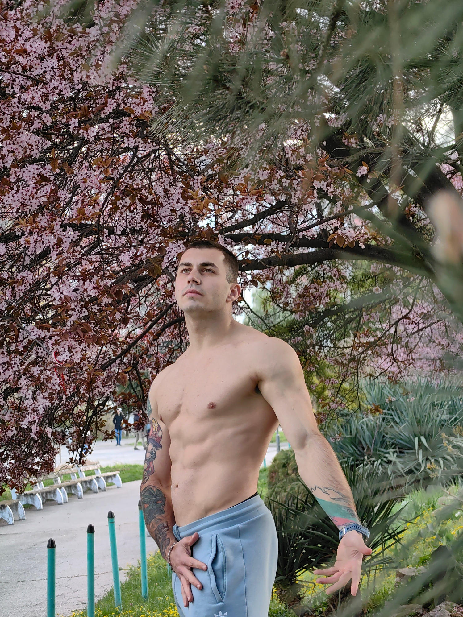 A shirtless, muscular man with a shaved head and tattoos on both arms stands outdoors in the city of Shumen, Bulgaria. The man is wearing light blue sweatpants. He is standing next to a tree in full b…read more