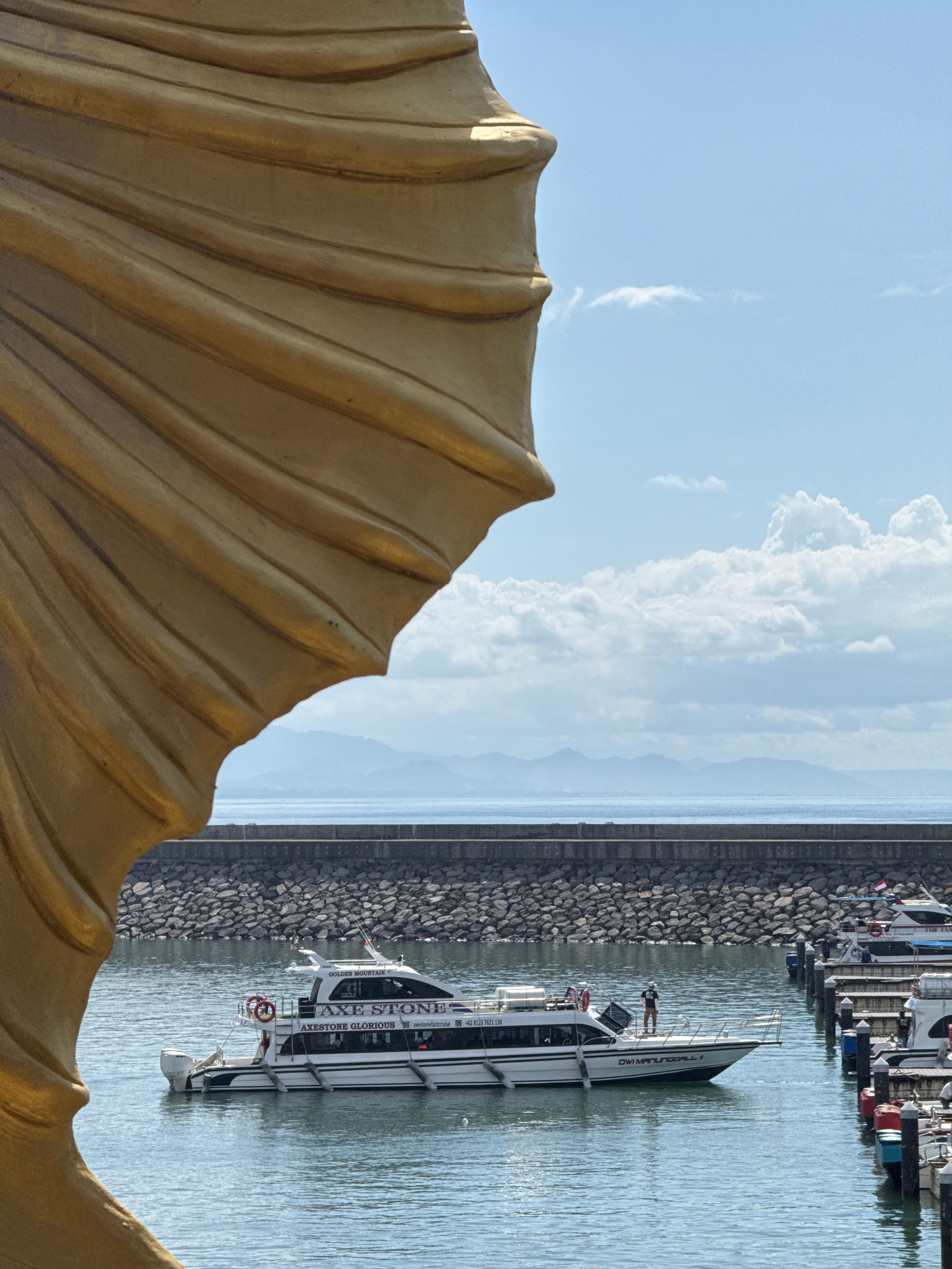 The image depicts a scenic view in Denpasar, Indonesia. In the foreground, there is a large, textured, golden-colored structure, possibly part of a sculpture or architectural element. Beyond that, the…read more