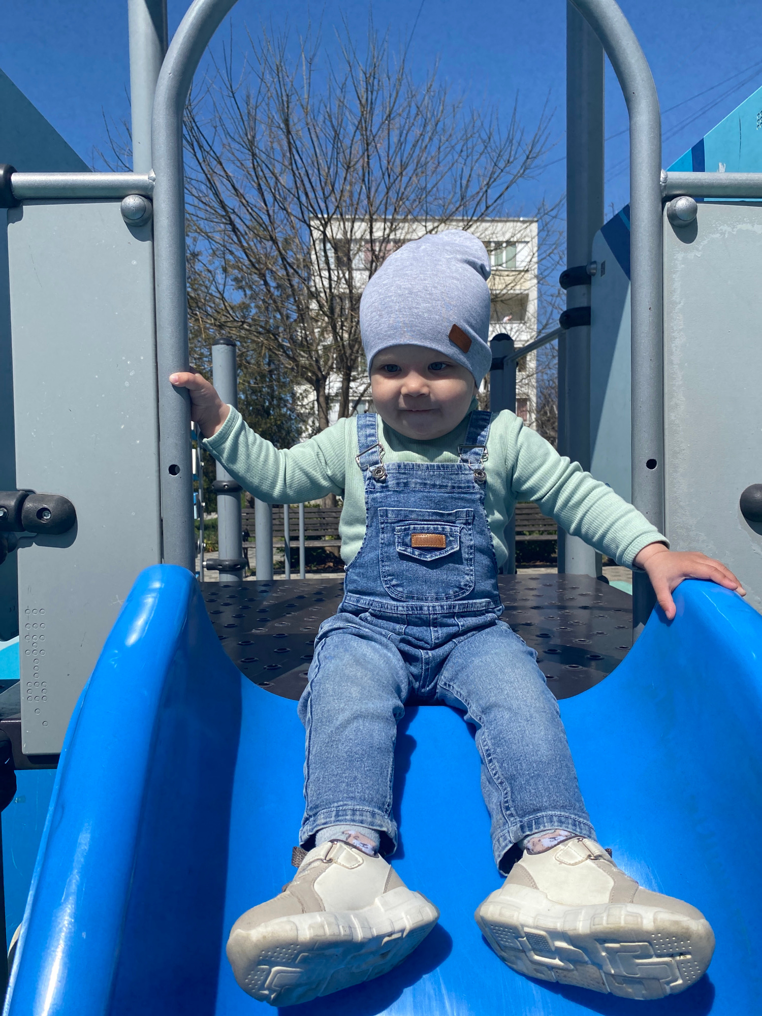 A young child in a grey hat and denim overalls sits on a blue playground slide. The child wears a light green long-sleeved shirt and beige shoes. The playground features grey metal bars and structures…read more