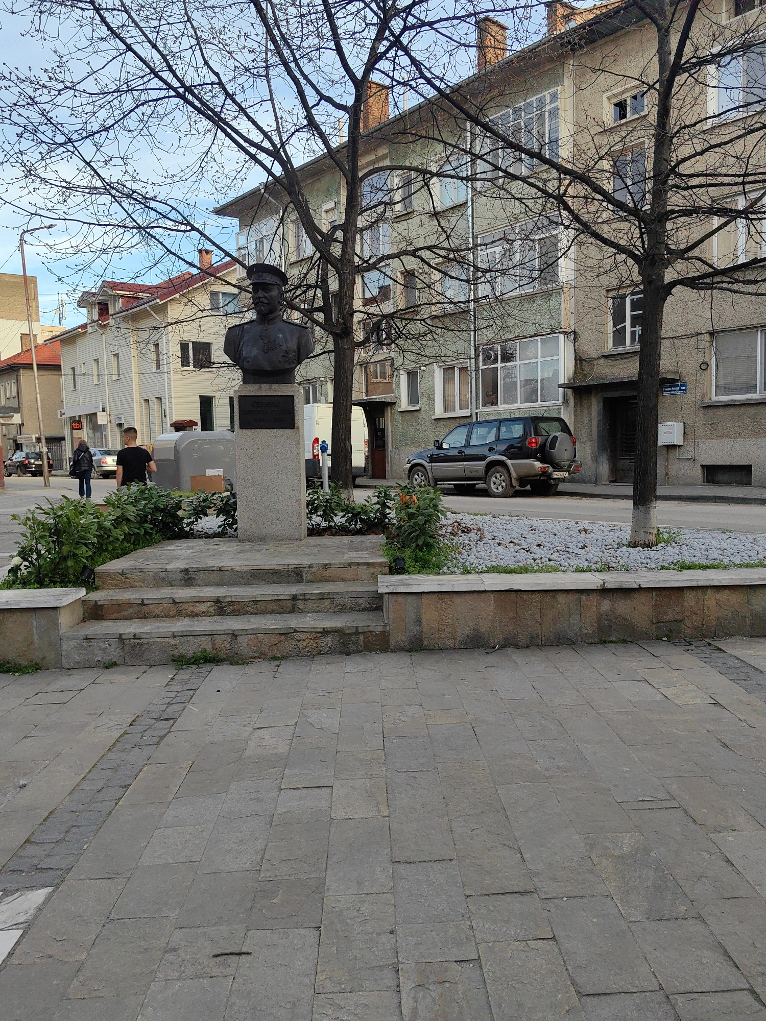 A street in Sevlievo, Bulgaria, features a bronze bust monument of a man in military garb on a stone pedestal, elevated by three stone steps. The monument is surrounded by greenery and a low stone wal…read more