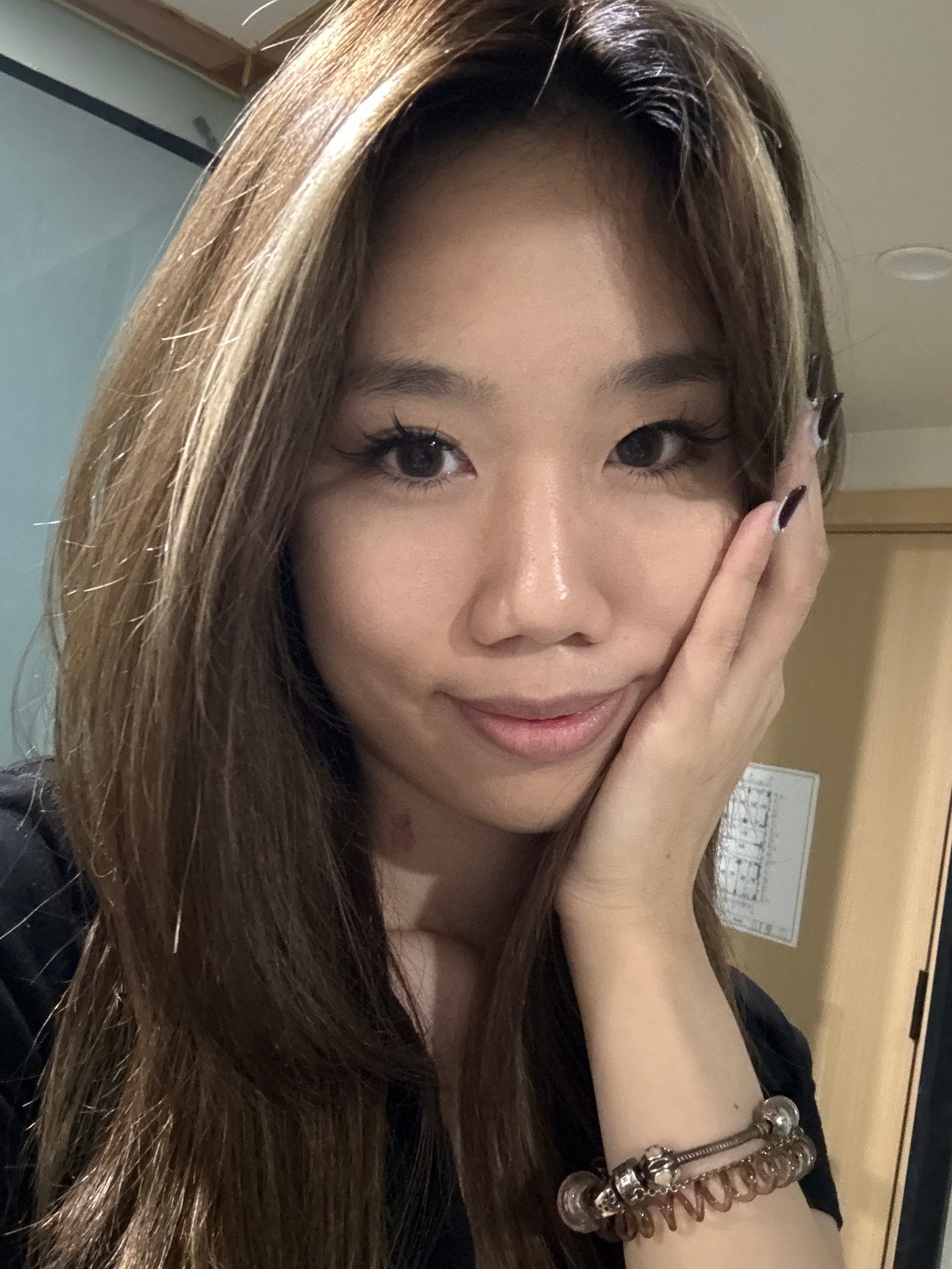 An Asian woman with light brown hair with blonde highlights is posing for a selfie. She is holding her hand to her face, with painted nails. She is wearing a bracelet. Behind her, there is a door and…read more
