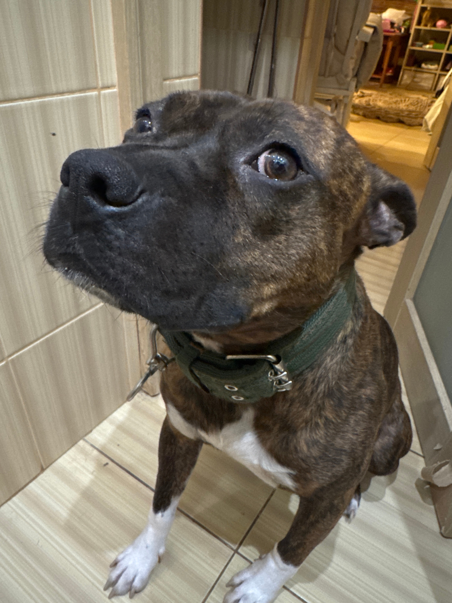 A brindle-patterned dog with a black muzzle and white paws is lying on a light beige tiled floor. The dog wears a green collar with silver buckles. The background shows a glimpse of a room with variou…read more