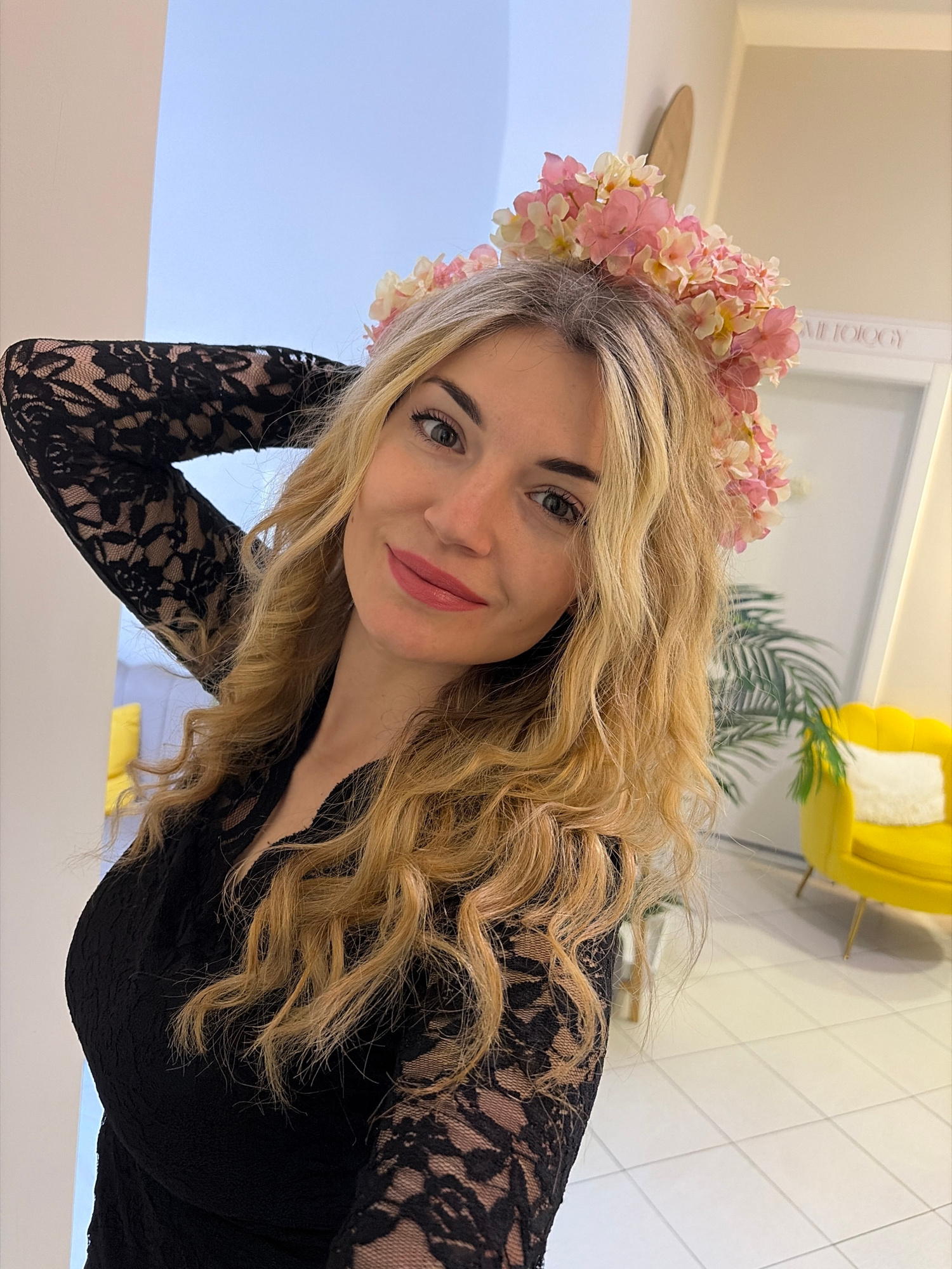 A woman with blonde, wavy hair wearing a flower crown of pink and white flowers is posing indoors. She is wearing a black lace top with long sleeves. The background includes a white wall with a white…read more