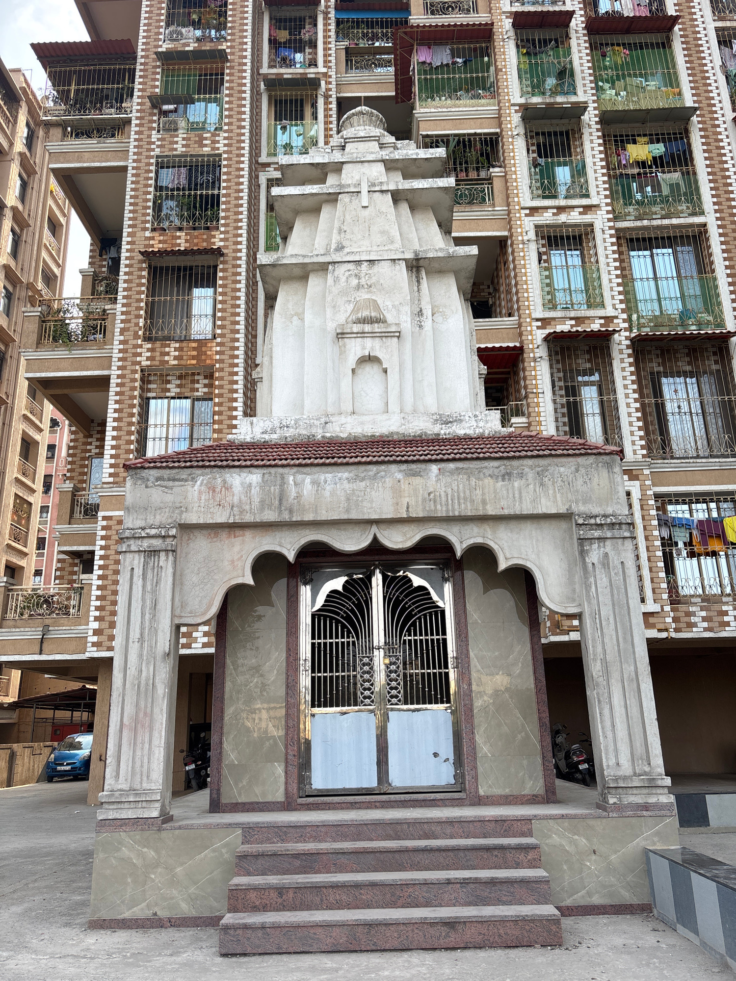 The image displays a small, multi-tiered Hindu temple situated in Ambernath, India, flanked by multi-story residential buildings under a clear sky. The temple's facade is constructed from weathered li…read more
