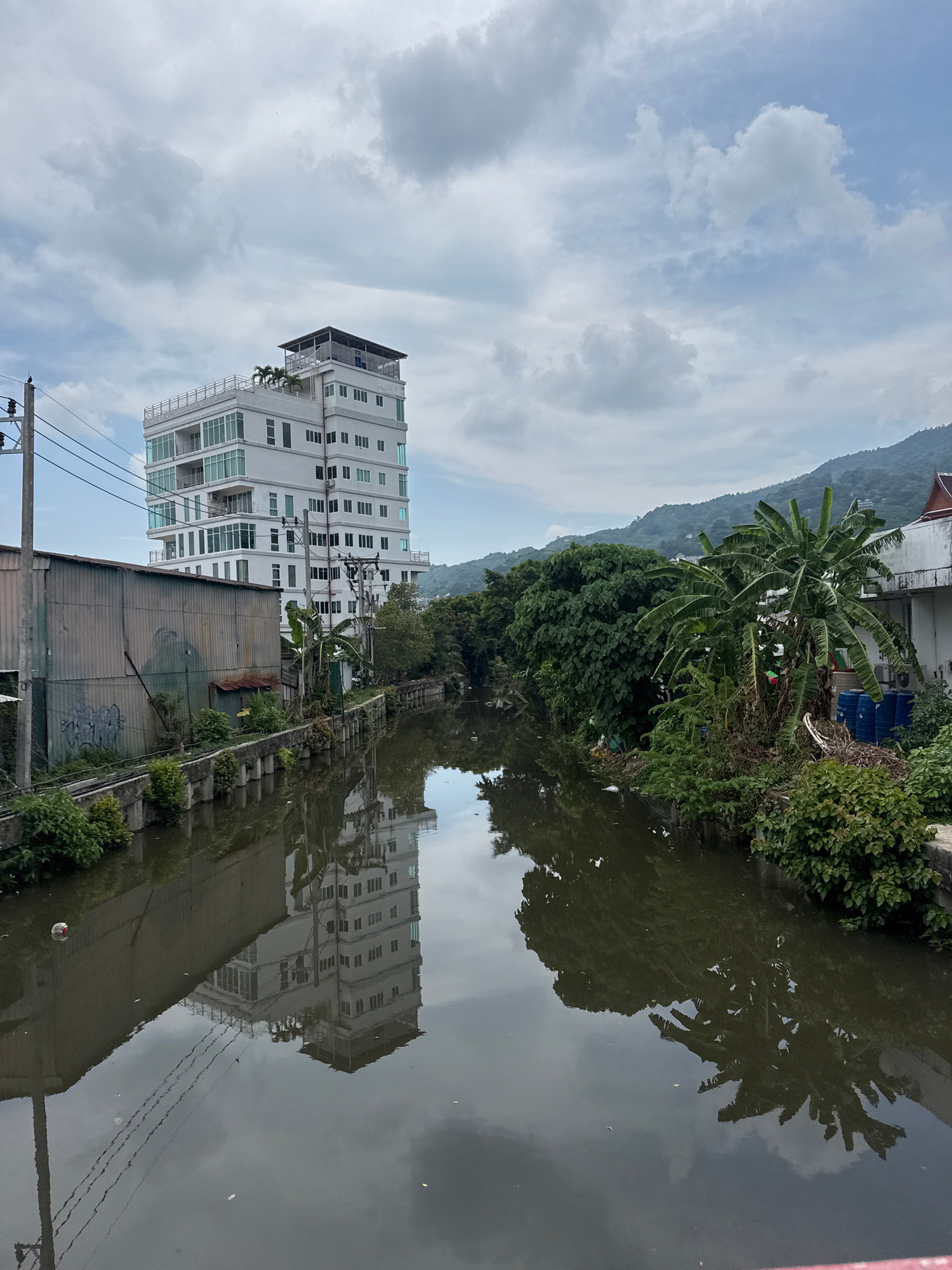 The image shows a body of water reflecting the sky, a tall building, and surrounding vegetation. The building is a white, multi-story structure with several windows and balconies. There is a mountain…read more