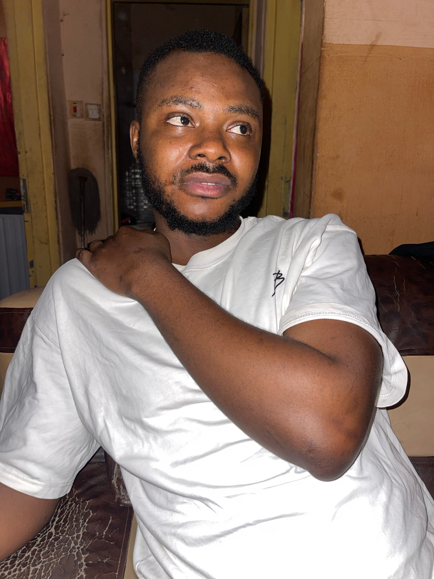 A man is lying on a patterned surface, likely a damaged leather sofa, in an interior setting. He is wearing a white t-shirt. The background appears to be a wall, suggesting a room indoors. The locatio…read more