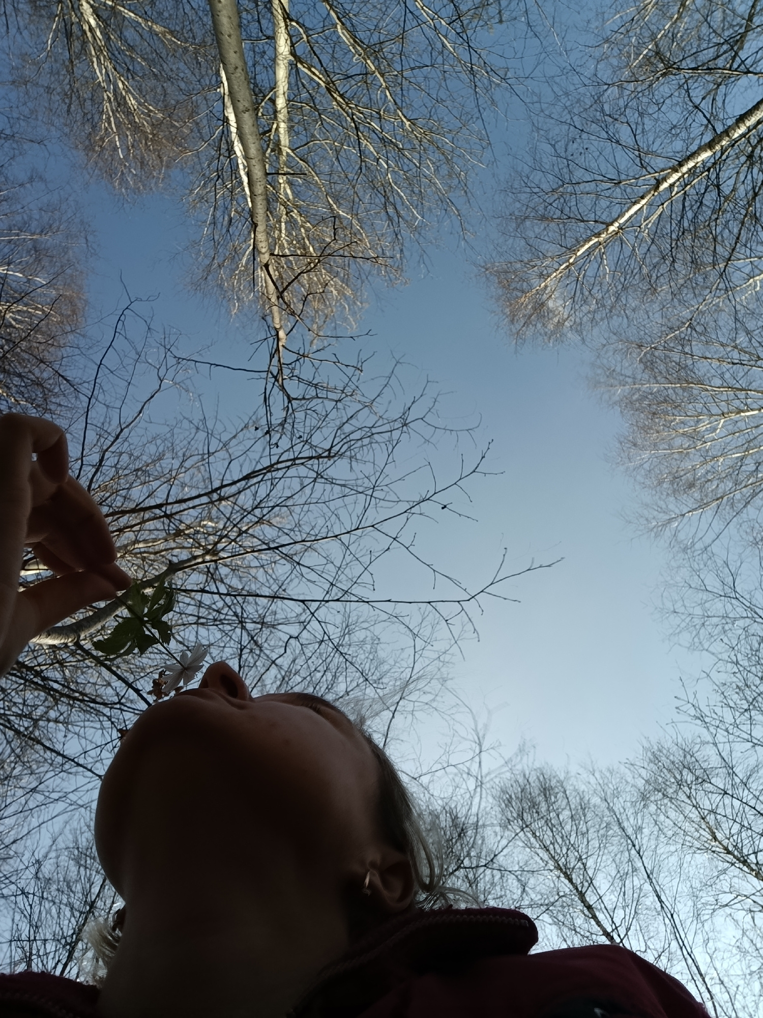 The image presents a low-angle perspective looking upwards through a canopy of bare tree branches into a clear blue sky. The intricate network of slender, leafless branches, with some visible trunks aβ¦read more