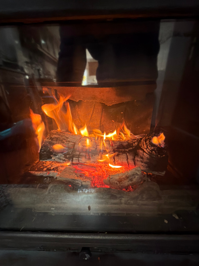 The image displays a contained fire burning within a dark-framed, glass-fronted wood-burning stove or fireplace insert, situated in Vila Real, Portugal. Several split wood logs are actively combusting…read more