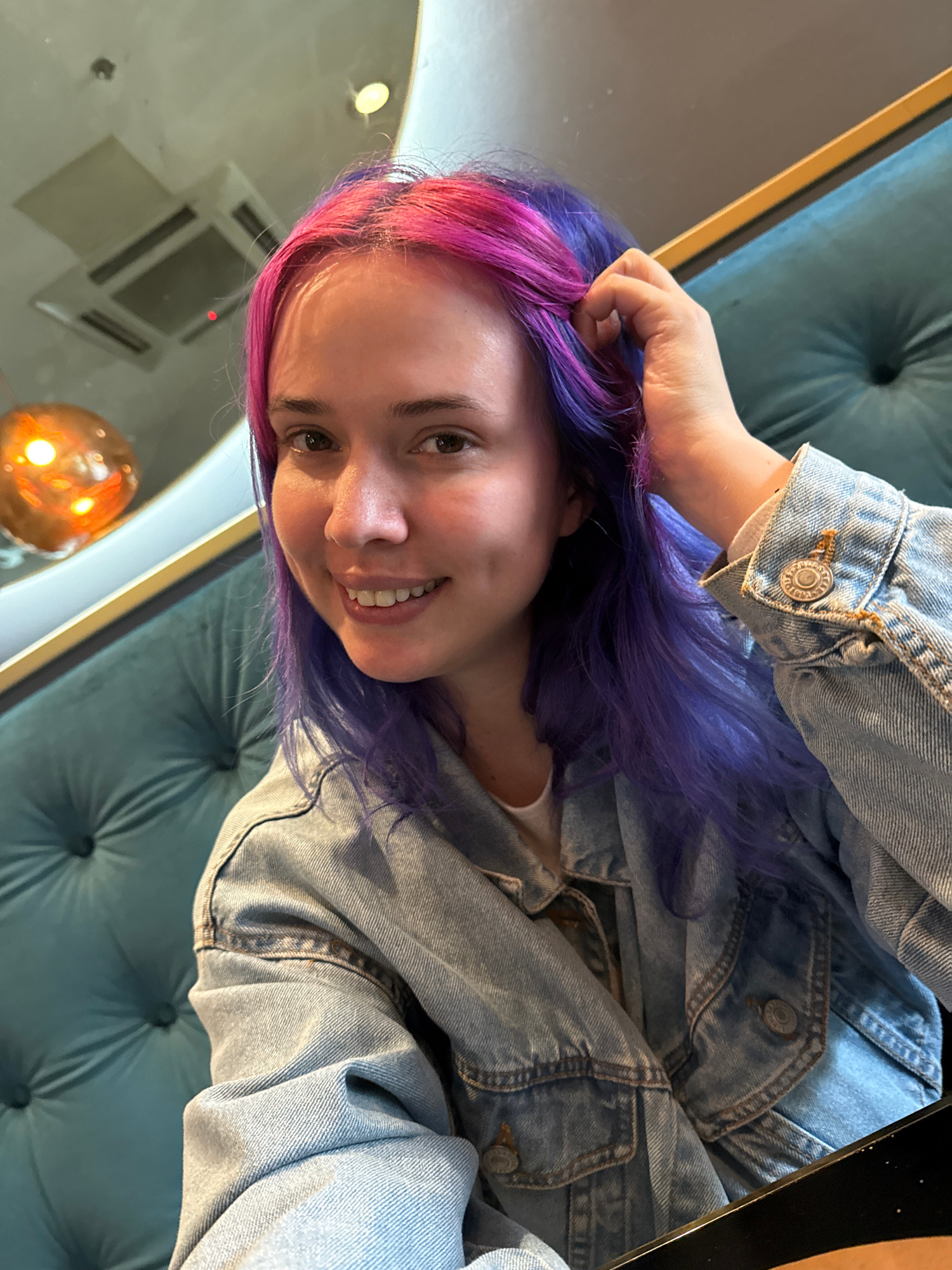 A young woman with dyed pink and purple hair is smiling at the camera. She is wearing a light-blue denim jacket. She is either sitting on or standing near a tufted blue-green upholstered object, possi…read more
