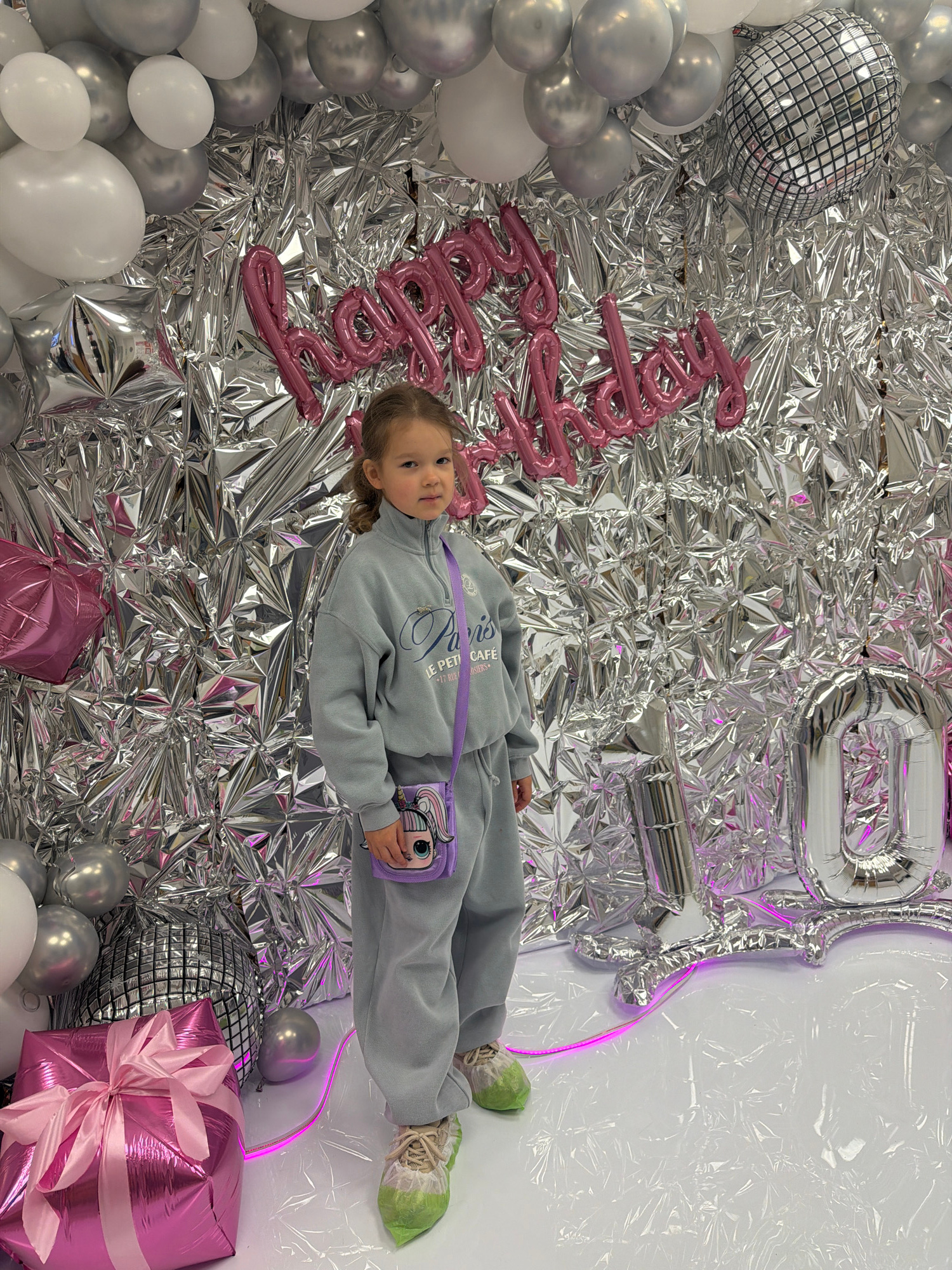 A young Caucasian girl is lying down on a silver, reflective surface, possibly a backdrop for a photograph. She is dressed in a grey sweatshirt and sweatpants, with a small purple purse with cartoon c…read more