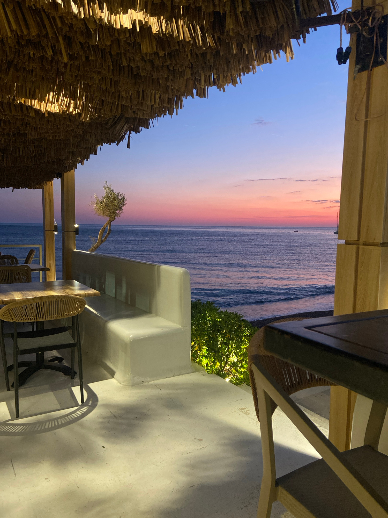 View from a restaurant patio in Petrovac centar, Montenegro, at sunset. The foreground features a patio with white walls, tables, and chairs made of wood and wicker. A green shrub is visible near the…read more