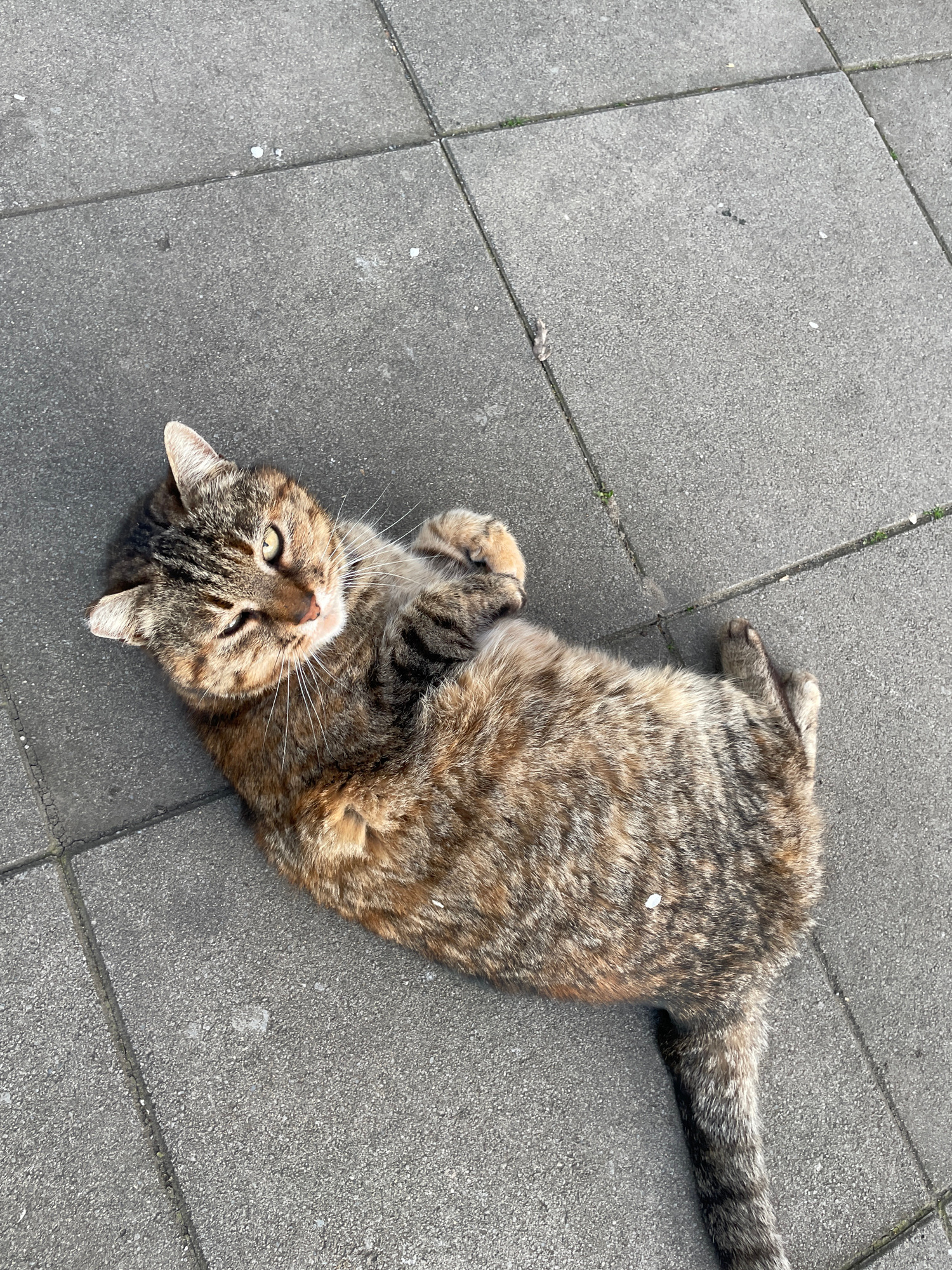 A cat lies on its back on a paved grey stone surface. The cat is predominantly brown and black with stripes on its head and tail, and it has one eye visible that is yellow. The paving stones are recta…read more