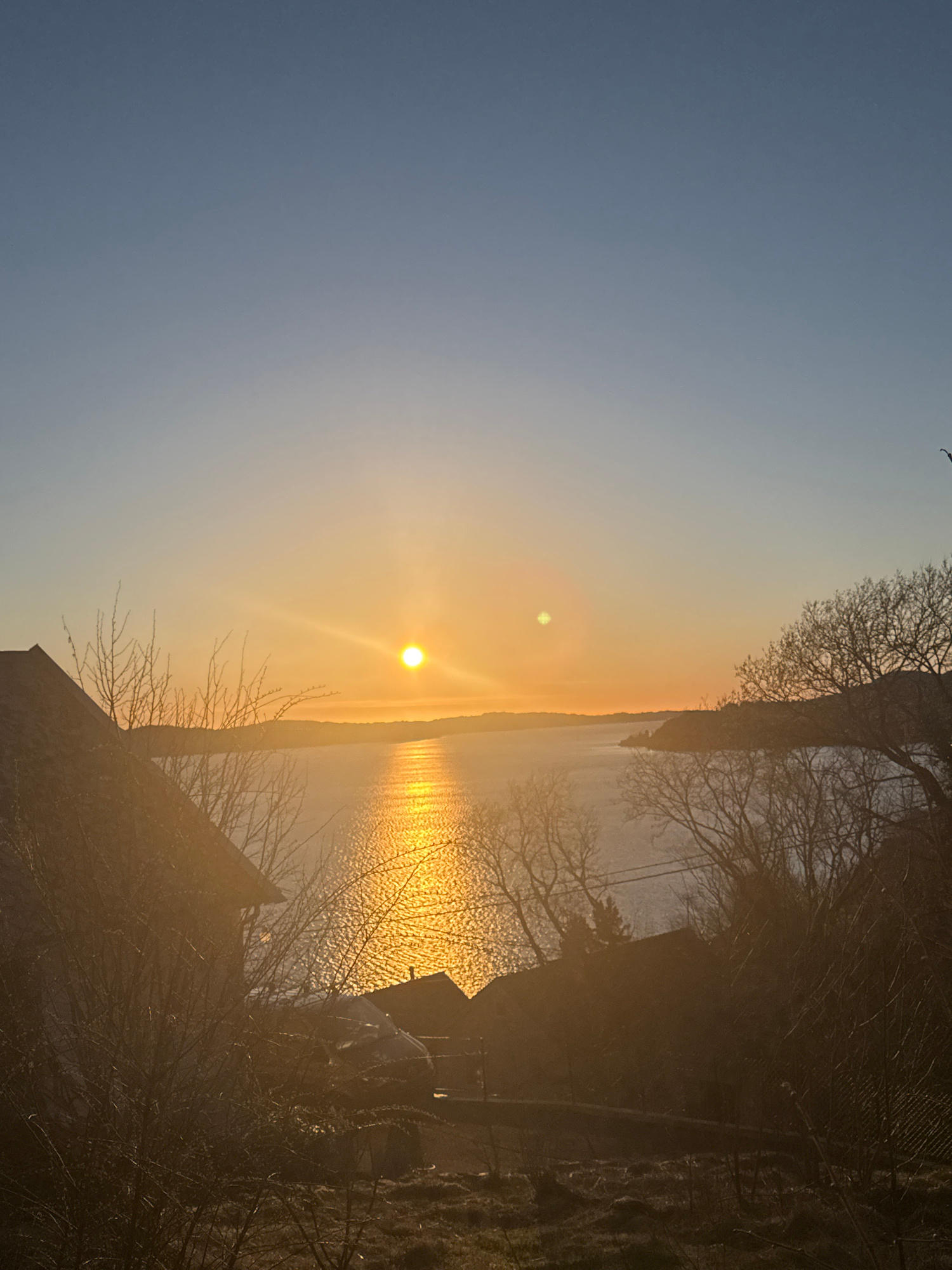 The image depicts a sunrise or sunset over water, likely a fjord, near Bergen, Norway. A body of water, possibly the Byfjorden, stretches across the center of the frame, reflecting the golden light of…read more