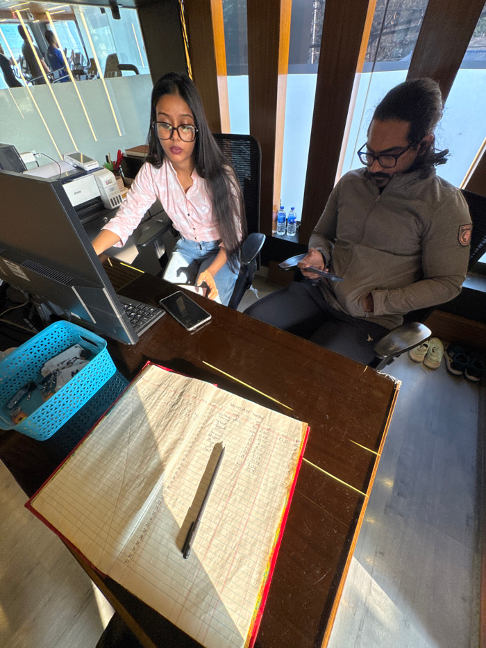 Two individuals are in an office setting. One person, wearing glasses and a light pink shirt, sits in front of a computer and monitor, with a blue basket nearby. The second individual, also wearing gl…read more