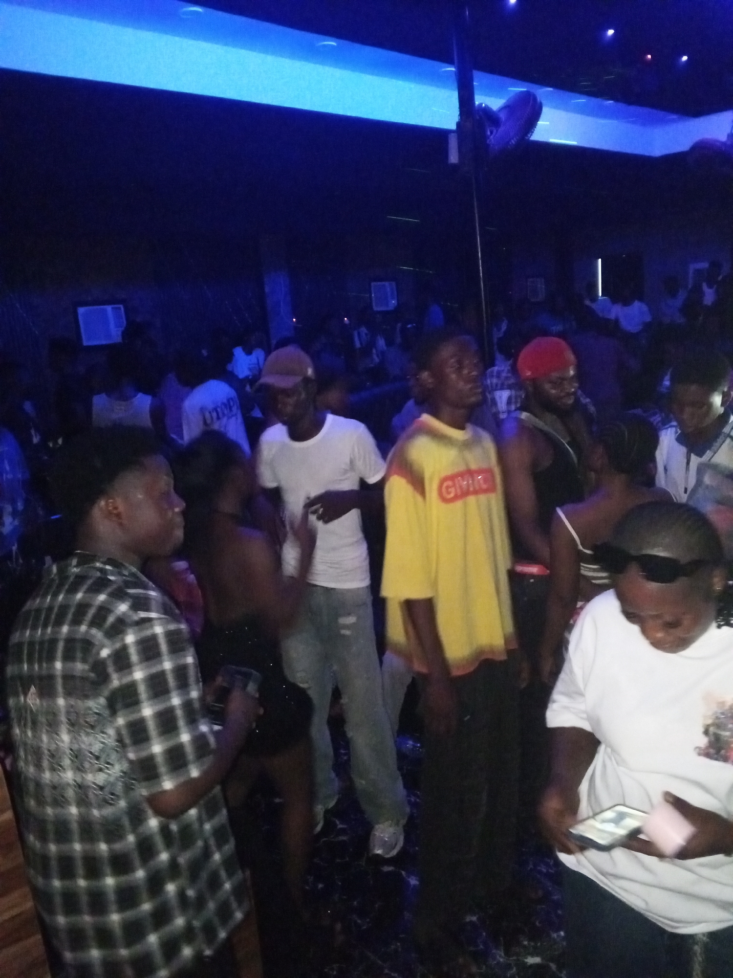 The image shows a crowded indoor scene in Lokoja, Nigeria, with blue lighting. Many people are present, some standing and others interacting. People are wearing various outfits, including t-shirts, pl…read more
