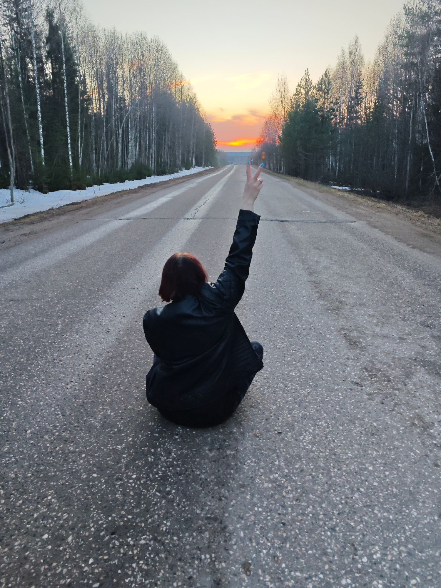 A full-body shot from the rear shows a person sitting on a grey asphalt road in Markovo, Russia. The person is wearing a black leather jacket and has short red hair. Their right arm is raised, display…read more