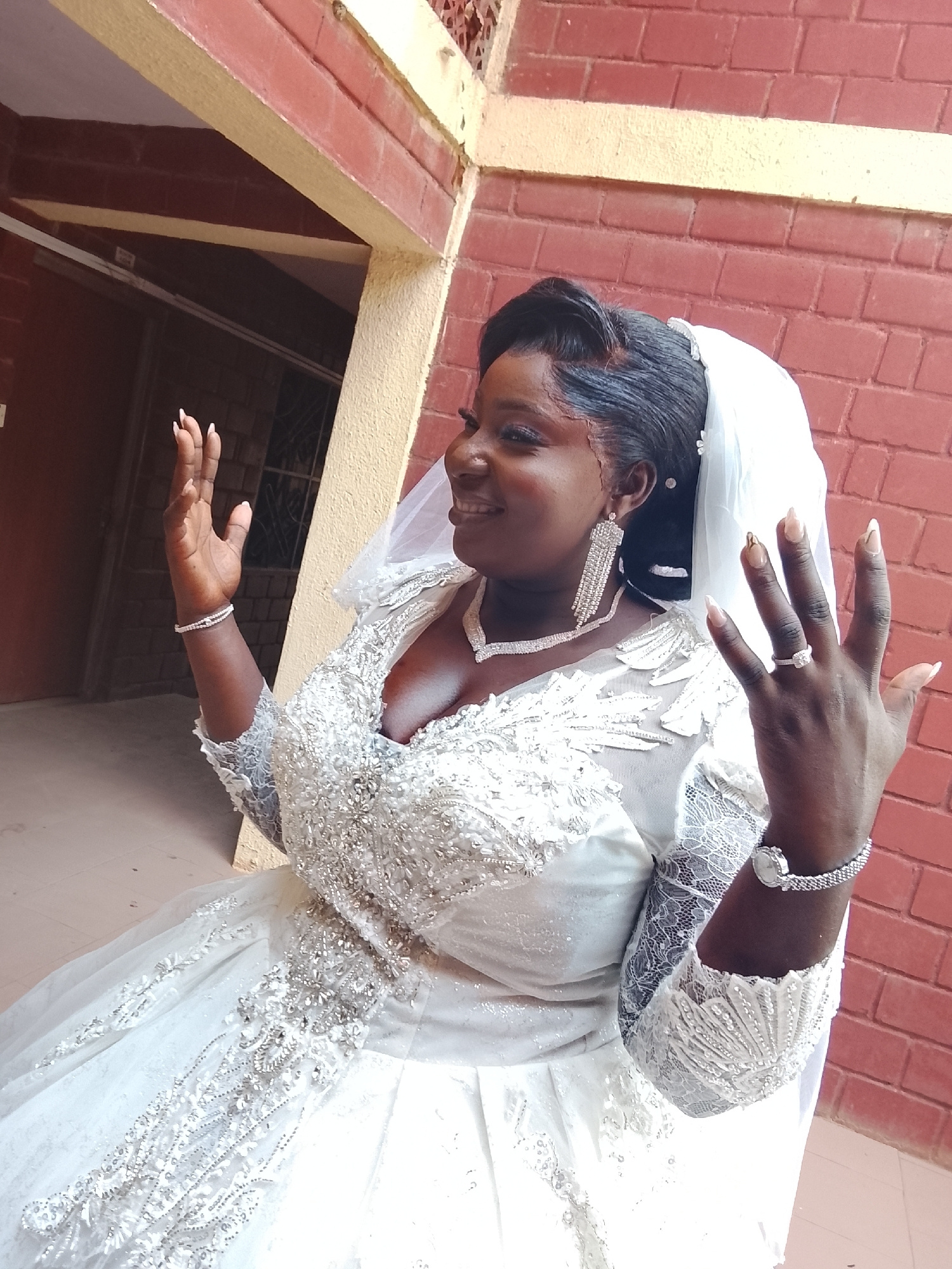 The image depicts a woman dressed in a white, heavily embellished wedding gown with a veil, situated outside a building in what appears to be the city of Unknown, Unknown. The building has a red brick…read more