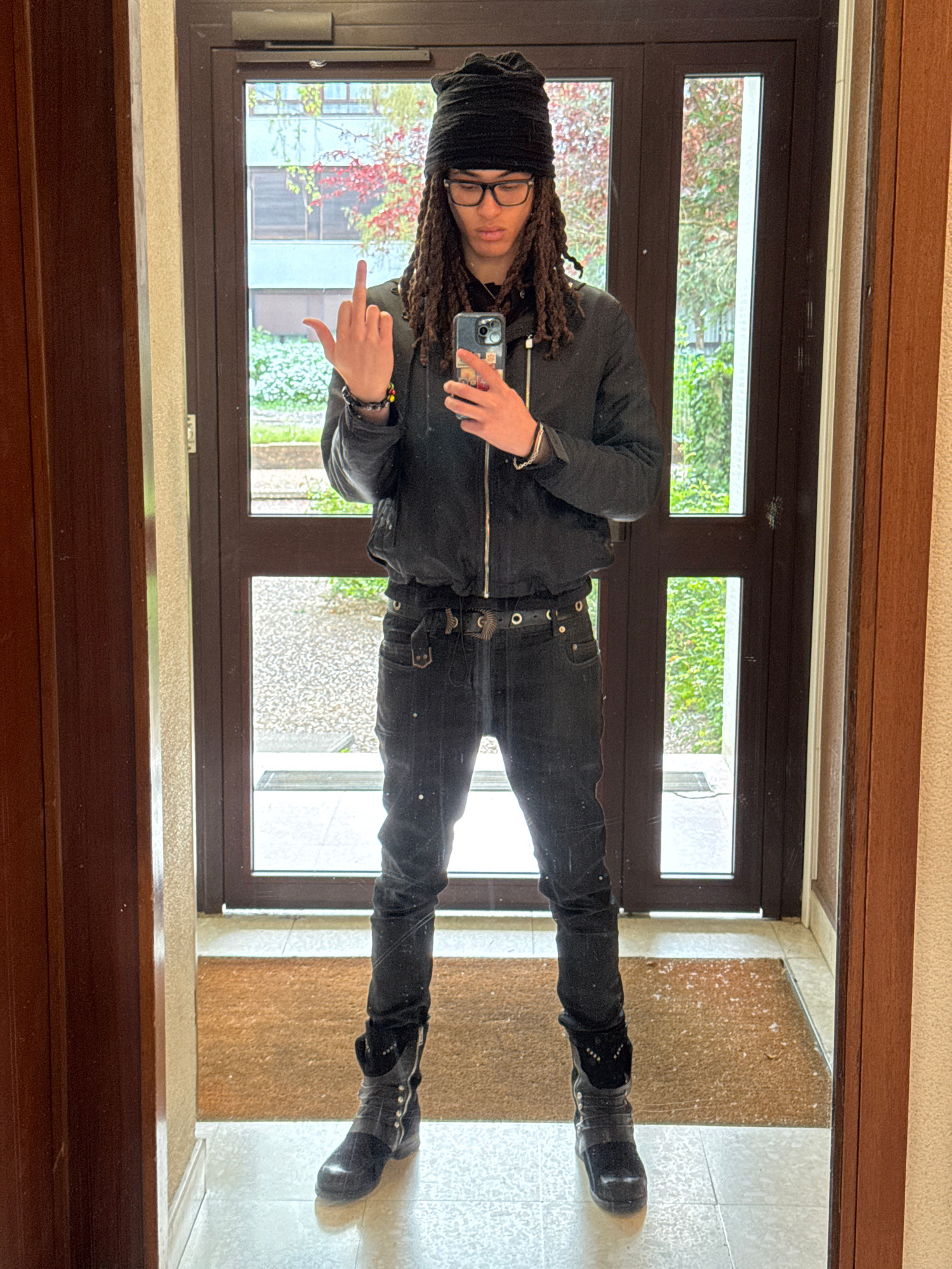 A person with dreadlocks and a black beanie is taking a mirror selfie while giving the middle finger. They are wearing glasses, a black jacket, black pants with a studded belt, and black boots. The re…read more
