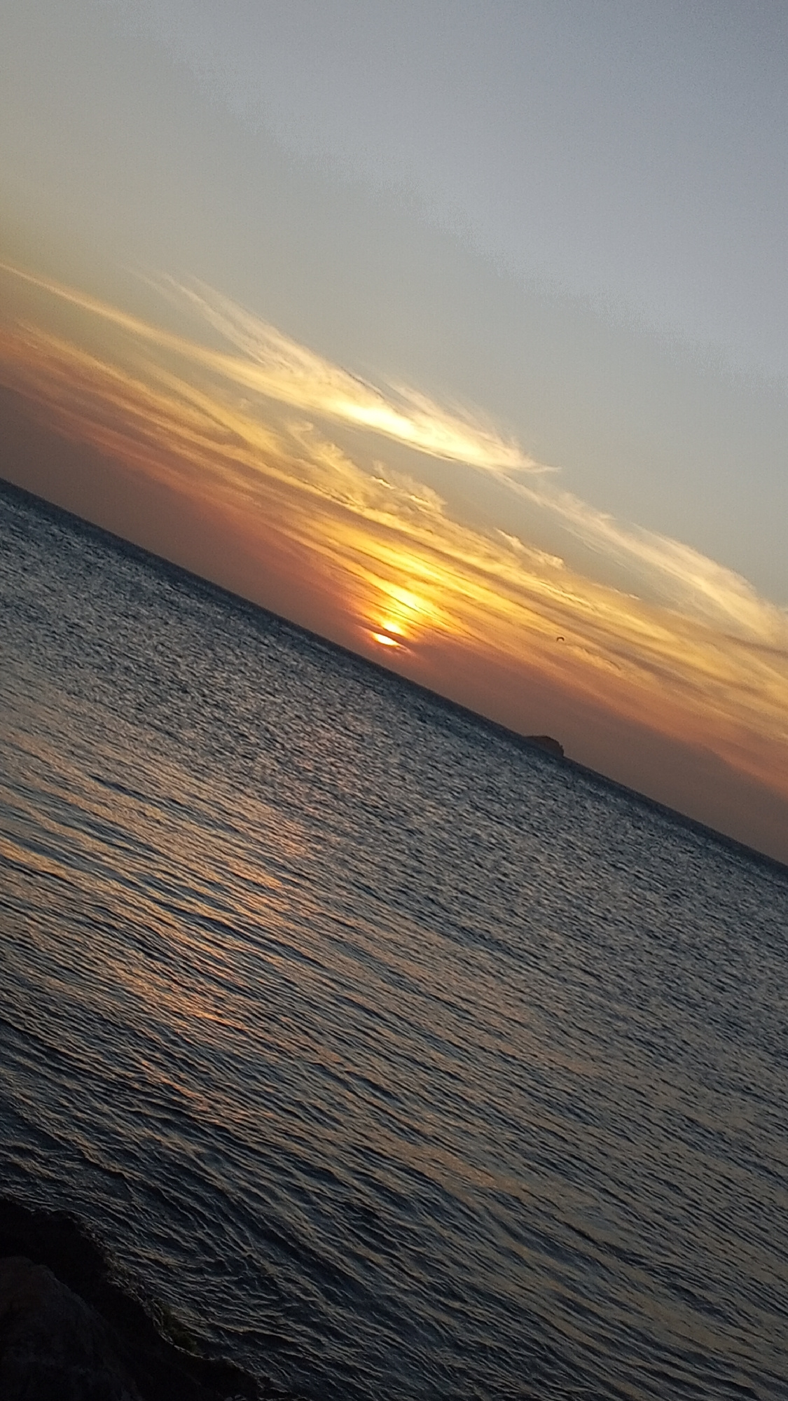 The image depicts a sunset over the ocean. The sun is low on the horizon, partially obscured by a cloud layer, creating an orange and yellow glow. The sky ranges from light gray to orange. The ocean r…read more