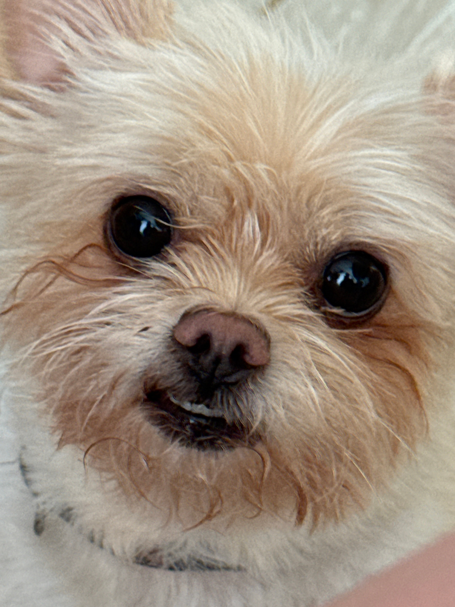A close-up shot shows the face of a small, fluffy dog with light brown fur. The dog has large, dark, glossy eyes and a brown nose with black nostrils. The fur around its face is long and slightly curl…read more