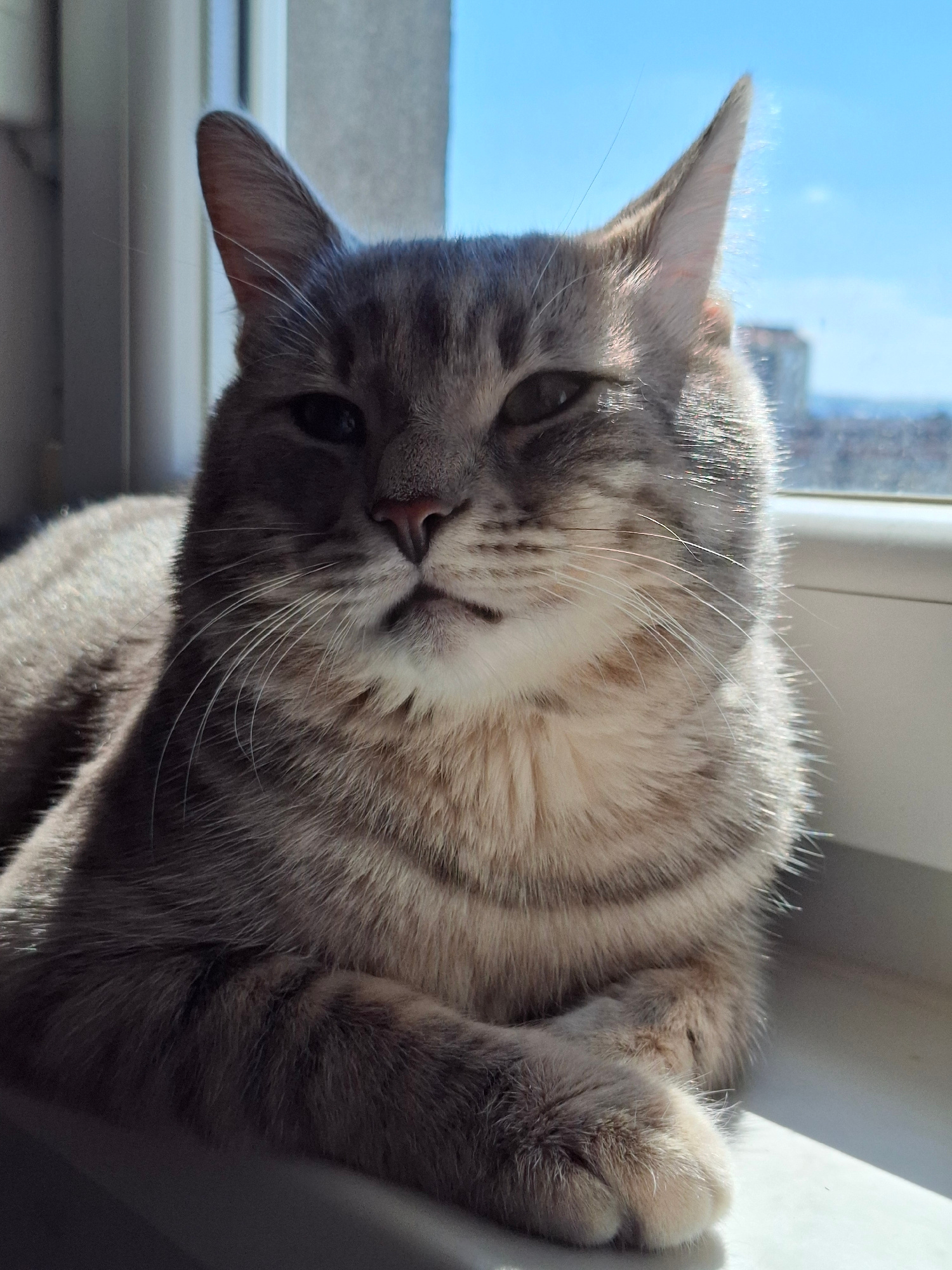 A close-up, medium-shot depicts a grey tabby cat lying on a white window sill. The cat is positioned diagonally, with its head towards the lower left and its body extending towards the upper right. Th…read more