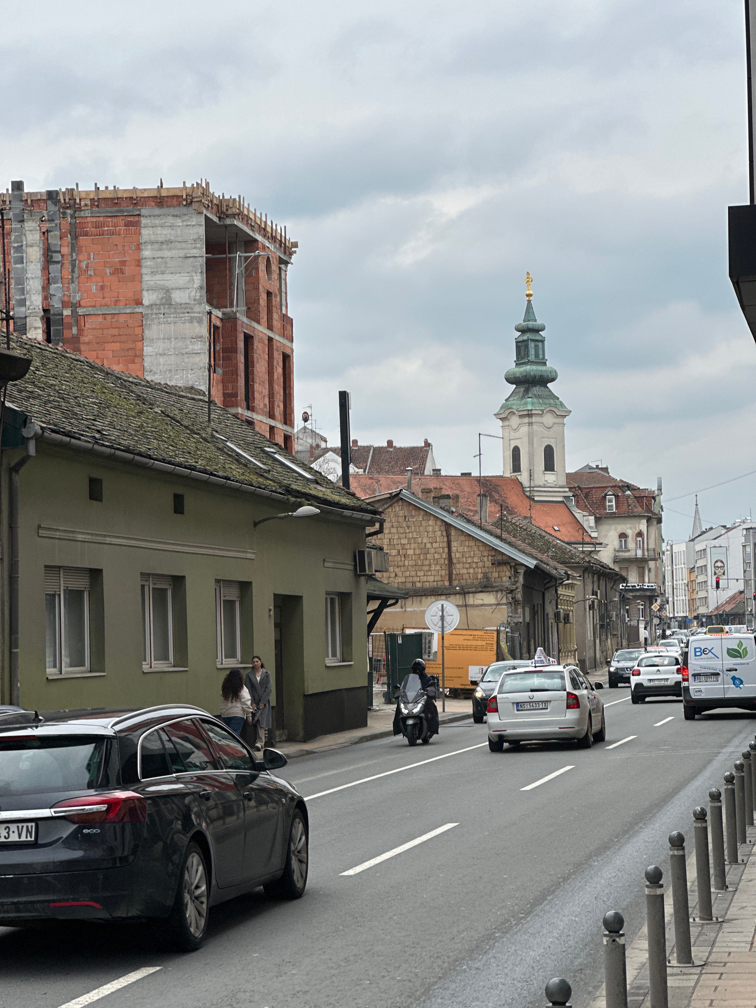 This image shows a street in Novi Sad, Serbia, featuring a mix of old and new architecture. A church tower rises in the distance among red-roofed buildings. In the foreground, a building under constru…read more