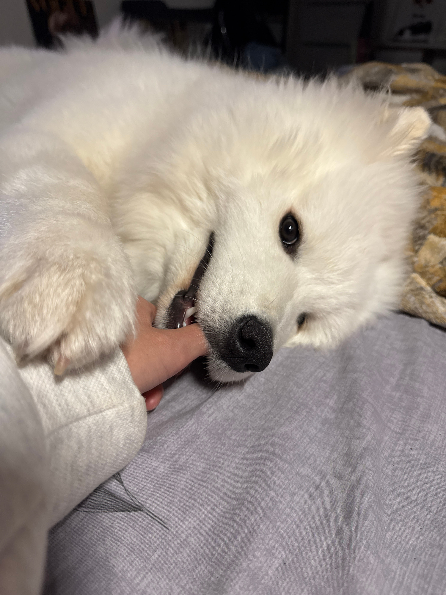 A close-up shot depicts a fluffy, white Samoyed dog gently biting a person's finger. The dog's black nose and eyes are prominent, and its teeth are visible where they touch the finger. The person's ha…read more